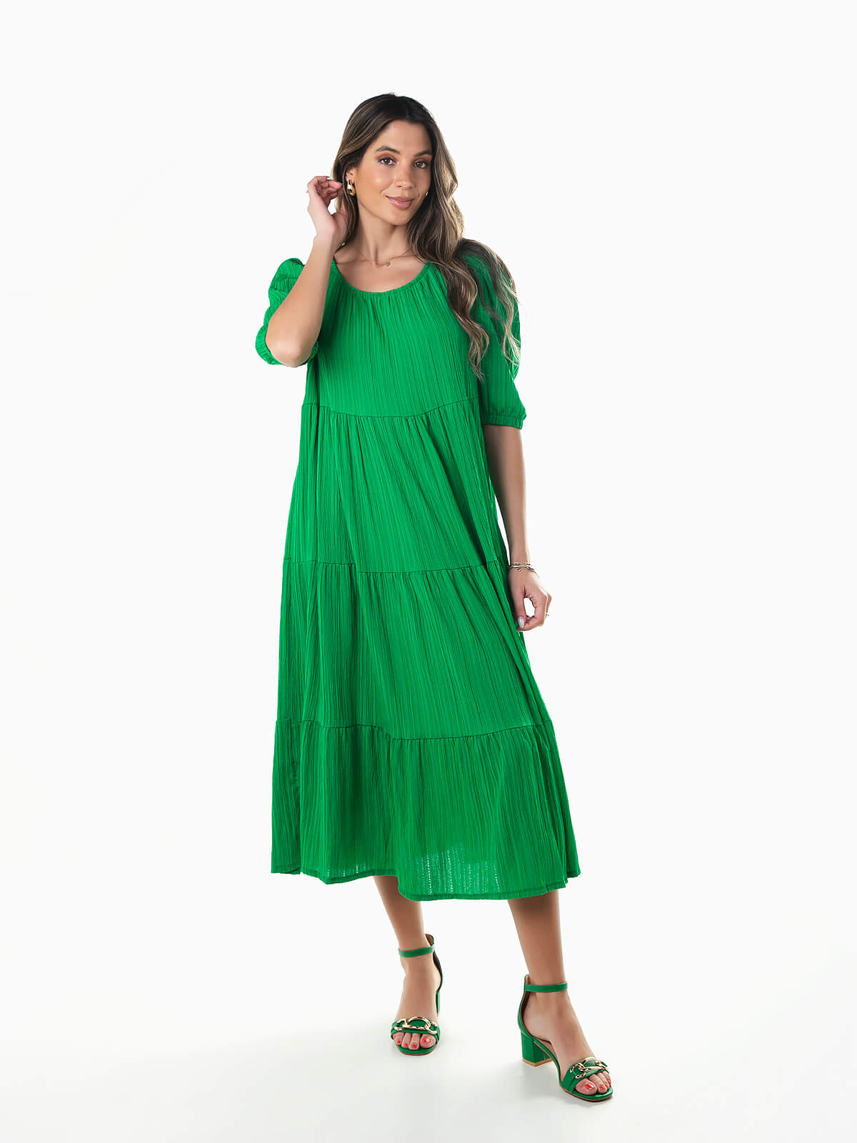 Vestido fluído midi com folhos
