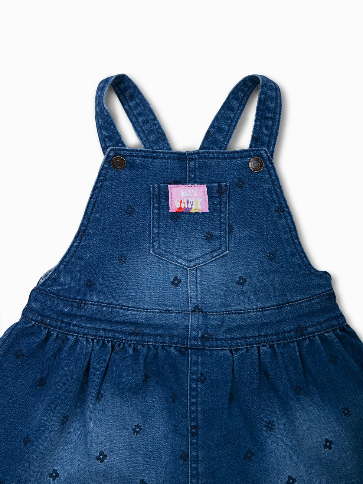 Vestido ganga com flores estampadas para bebé menina. Saia jardineira com alças e aperto de botões pressão. Bolso no peito.