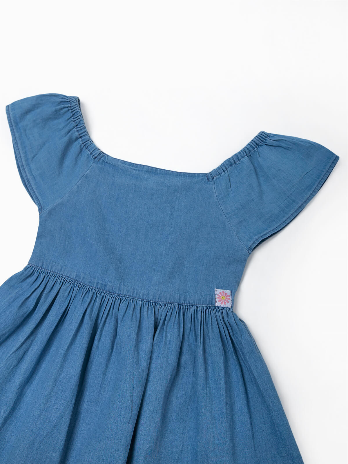 Vestido de manga curta em ganga para menina. Vestido de corte godê com decote barco. Cintura elástica com aperto posterior de botão.