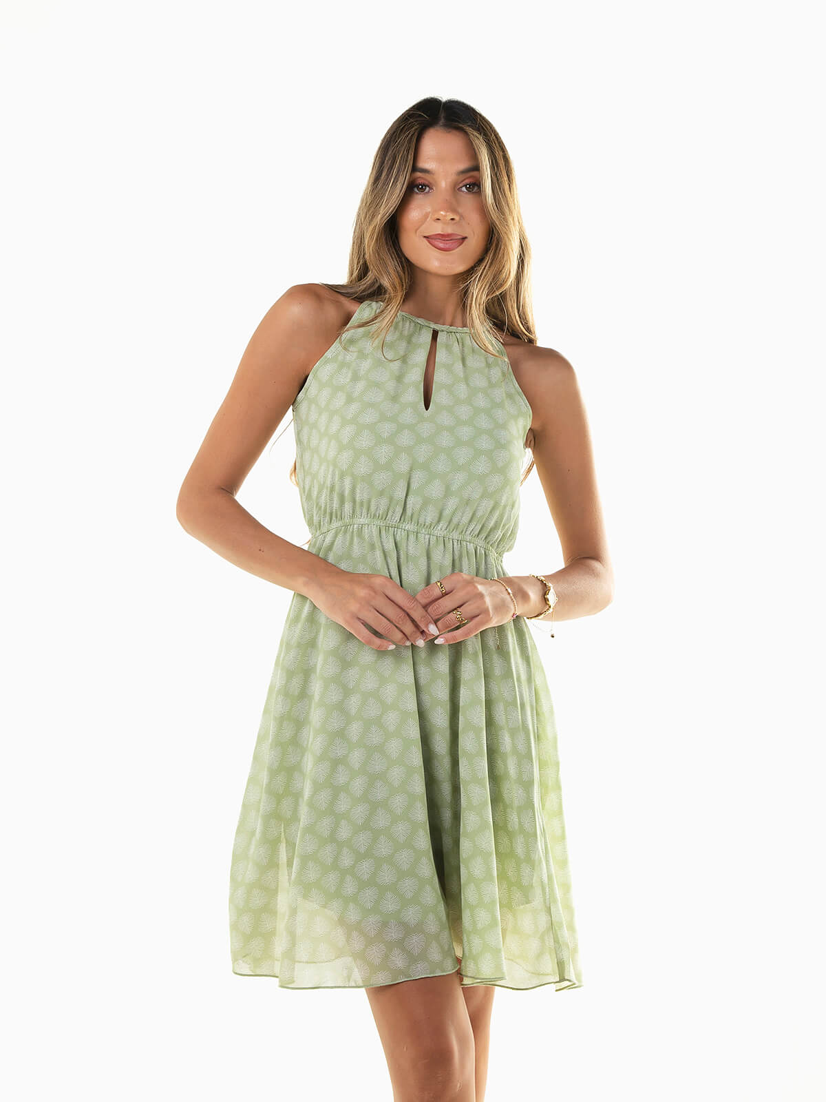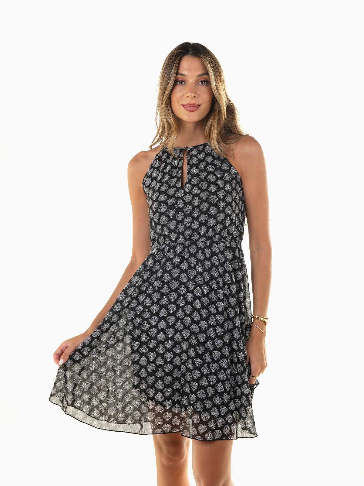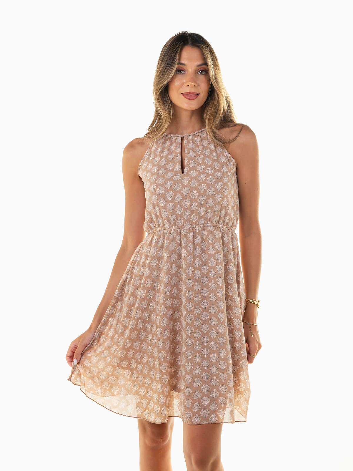 Vestido curto com padrão, decote halter e abertura para mulher. Vestido com cintura elástica e cordão na gola para ajustar. Interior forrado. Fresco e fluído.