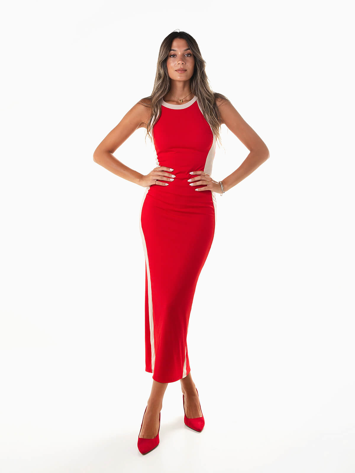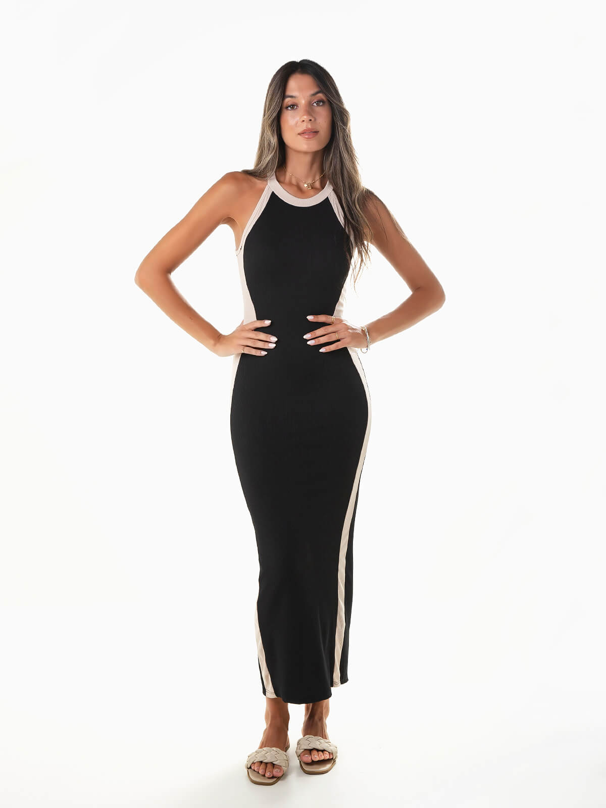 Vestido justo comprido em malha canelada para senhora. Vestido bicolor sem mangas com decote halter e abertura na parte posterior. Altura da Modelo: 175 cm | Tamanho: Tamanho Único