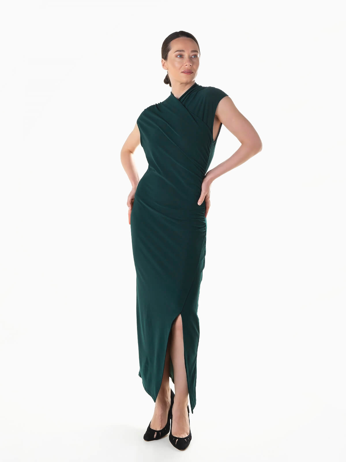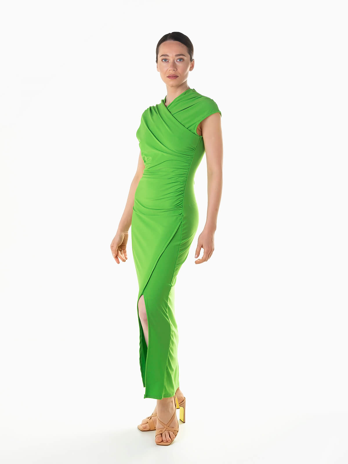 Vestido justo comprido com pormenores franzidos. Vestido tubo elástico de manga cava com decote cruzado. Abertura na base.