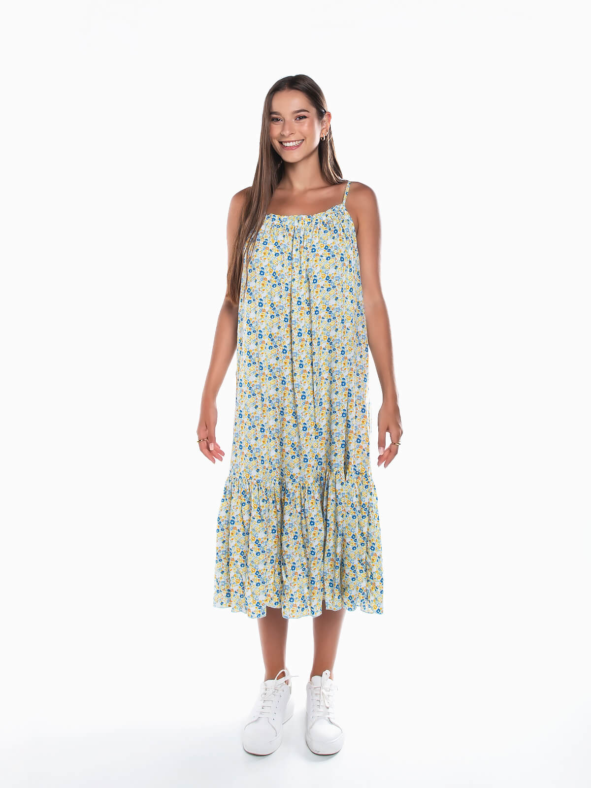 Vestido largo midi com estampado floral para senhora. Vestido em tecido 100% algodão com encaixe de folho na base e alças finas. Decote redondo.