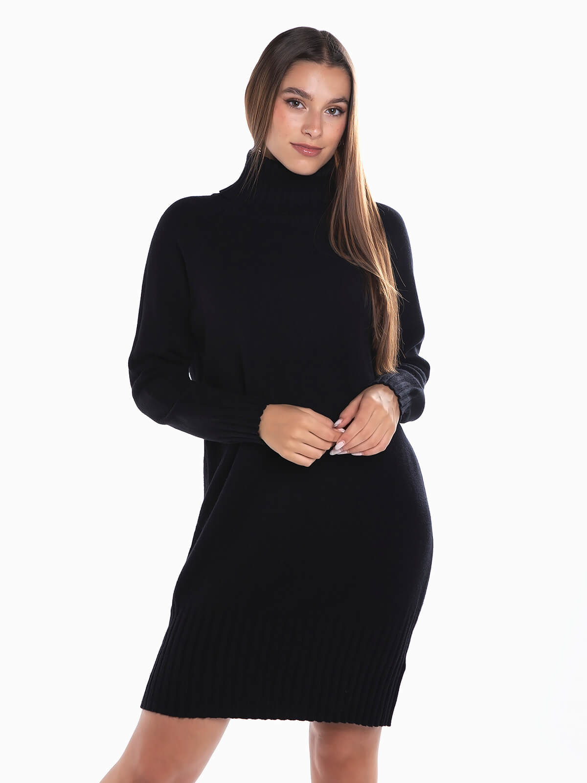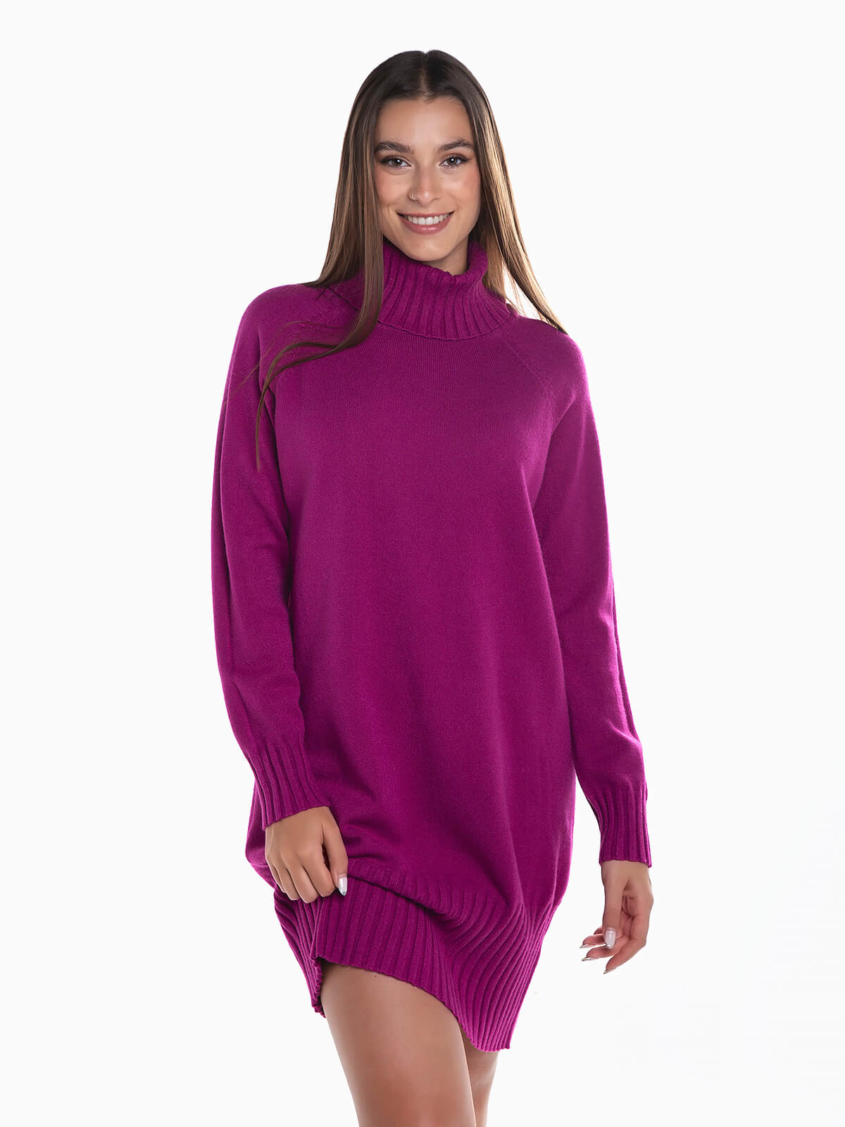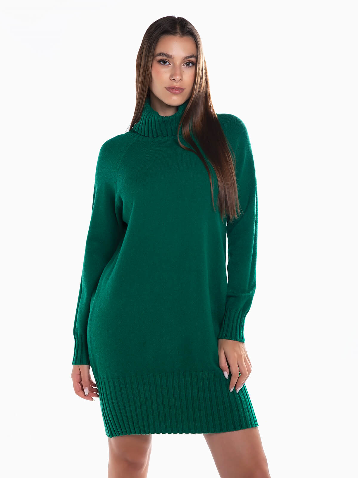 Vestido de malha com gola alta dobrada para senhora. Vestido curto manga comprida raglan com extremidades canelados.
