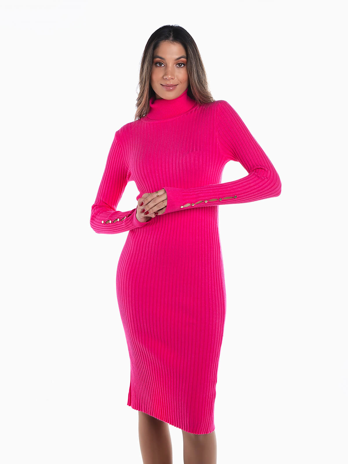 Vestido midi em malha canelada para senhora. Vestido manga comprida com gola alta dobrada. Punhos abotoados. Parte posterior com abertura.