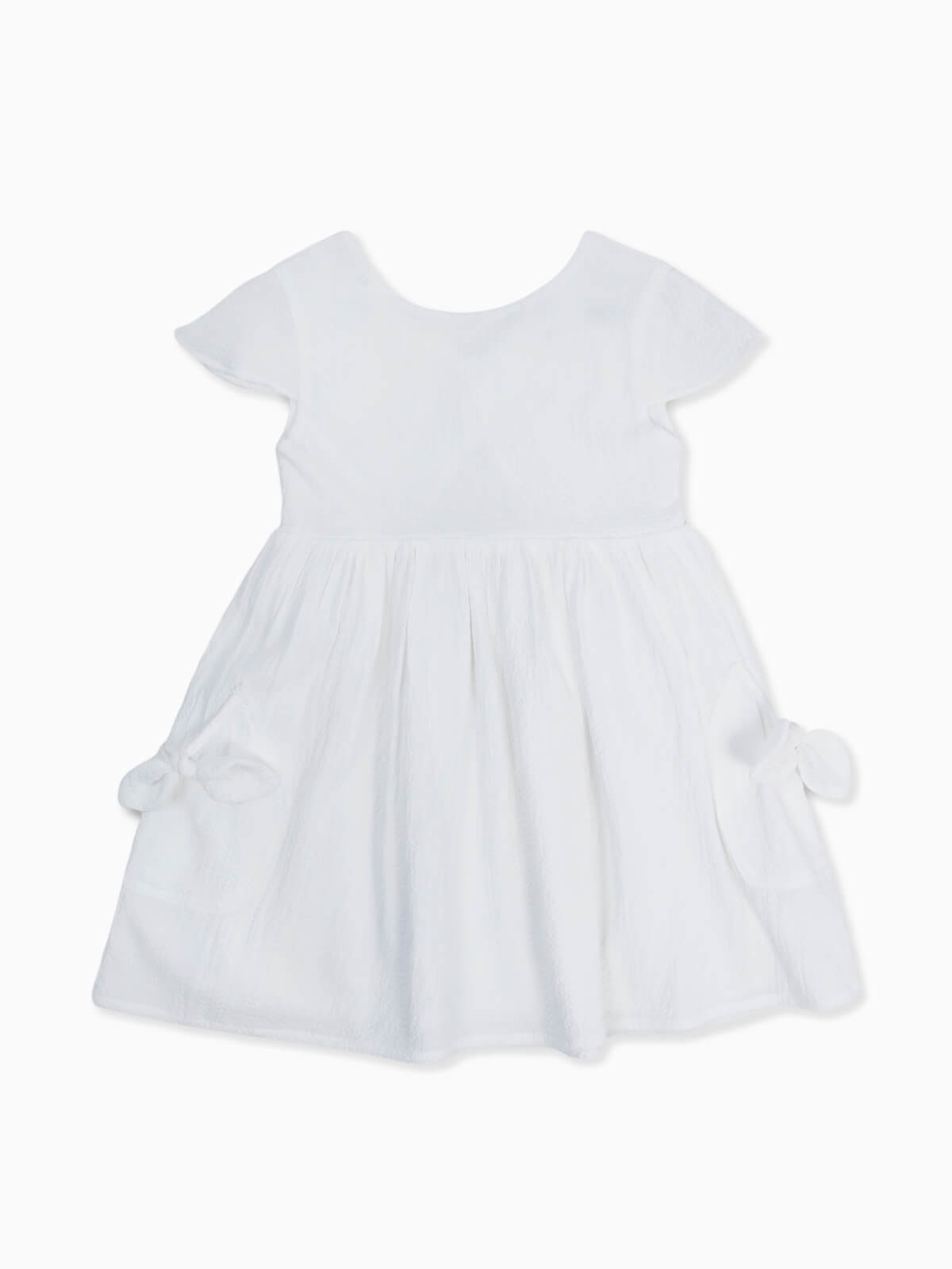 Vestido de manga curta em tecido com textura para menina. Vestido com interior forrado e pormenor de dois bolsos com laço aplicado. Cintura elástica e aperto posterior de botões.