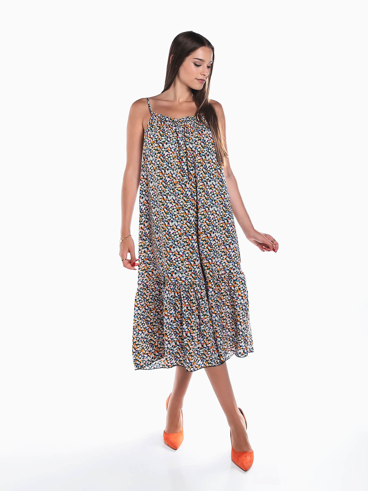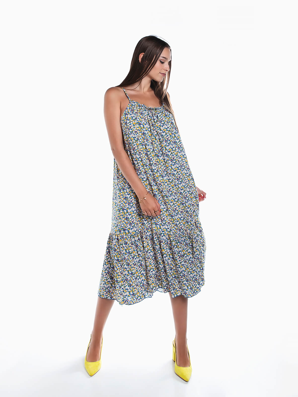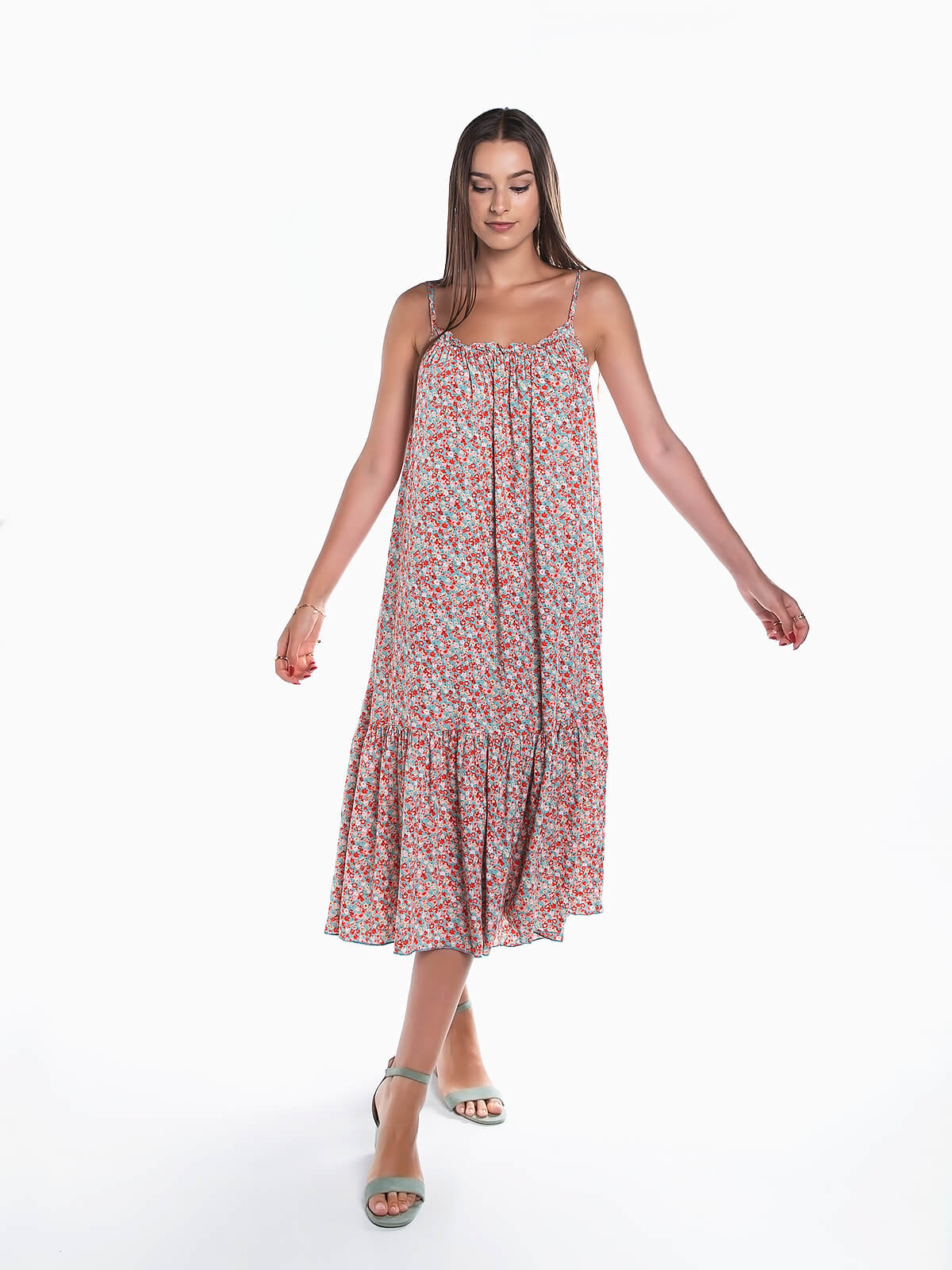 Vestido midi com alças finas e estampado floral. Vestido em tecido 100% algodão leve e fluído com folho aplicado na base. Decote redondo.