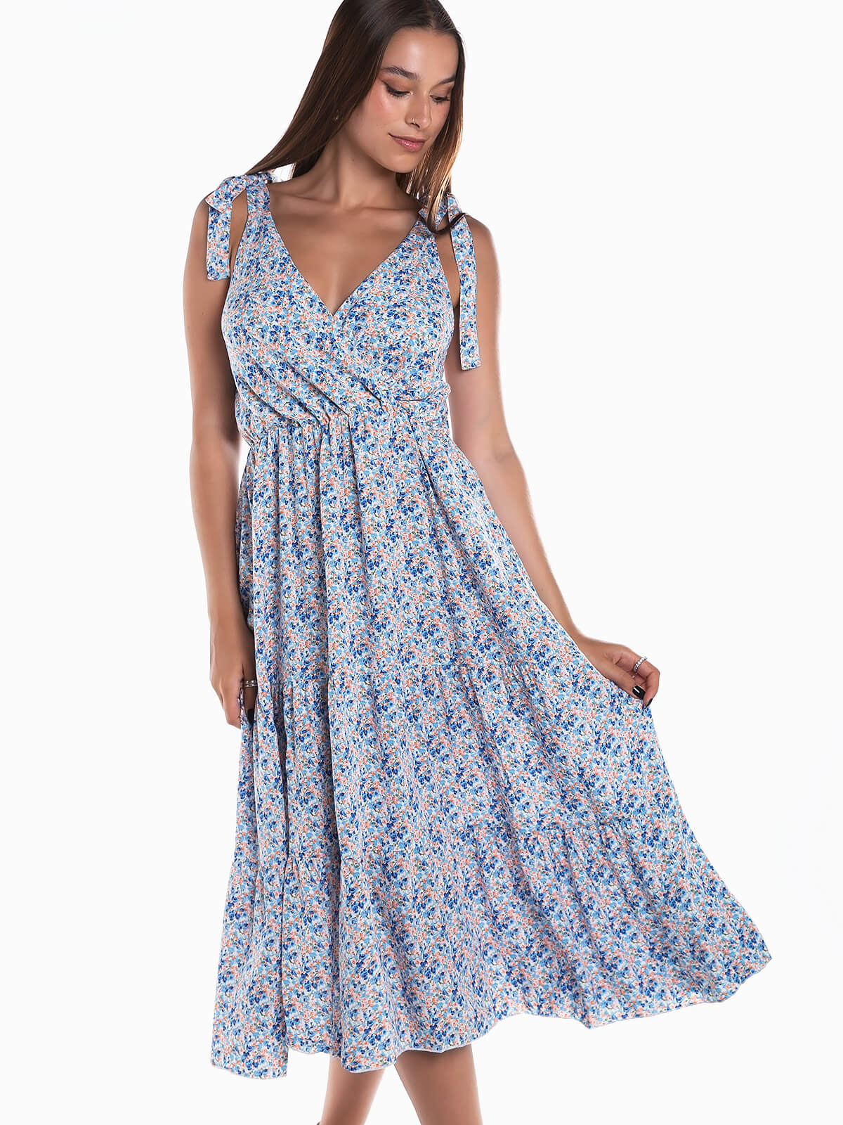 Vestido midi com alças em tecido para laço. Vestido em tecido 100% algodão com decote cruzado e encaixe de folho na base. Cintura elástica.