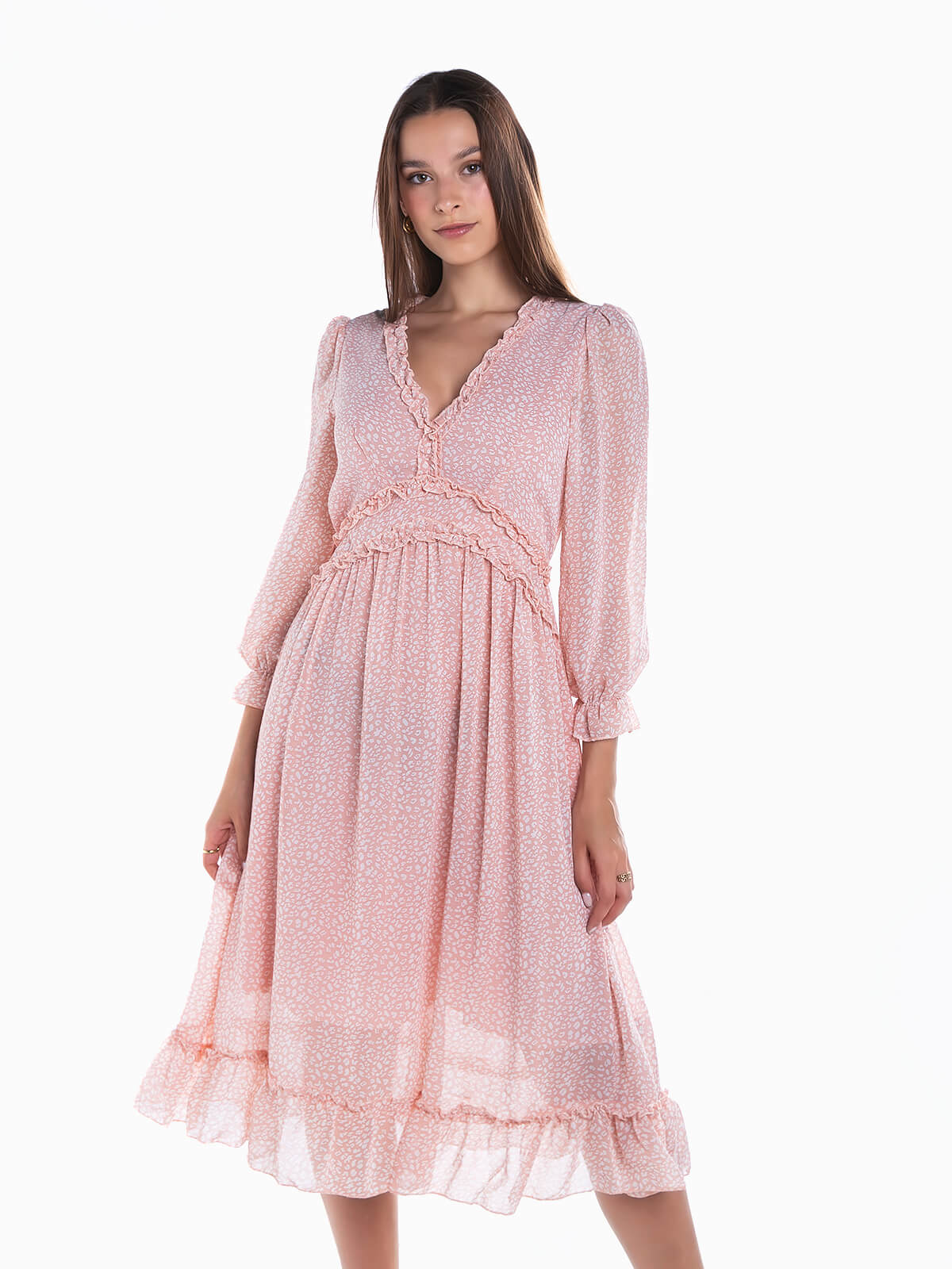 Vestido midi animal print para senhora. Vestido em tecido leve e fluído de manga 3/4 acabada em folho. Decote em bico. Interior forrado.