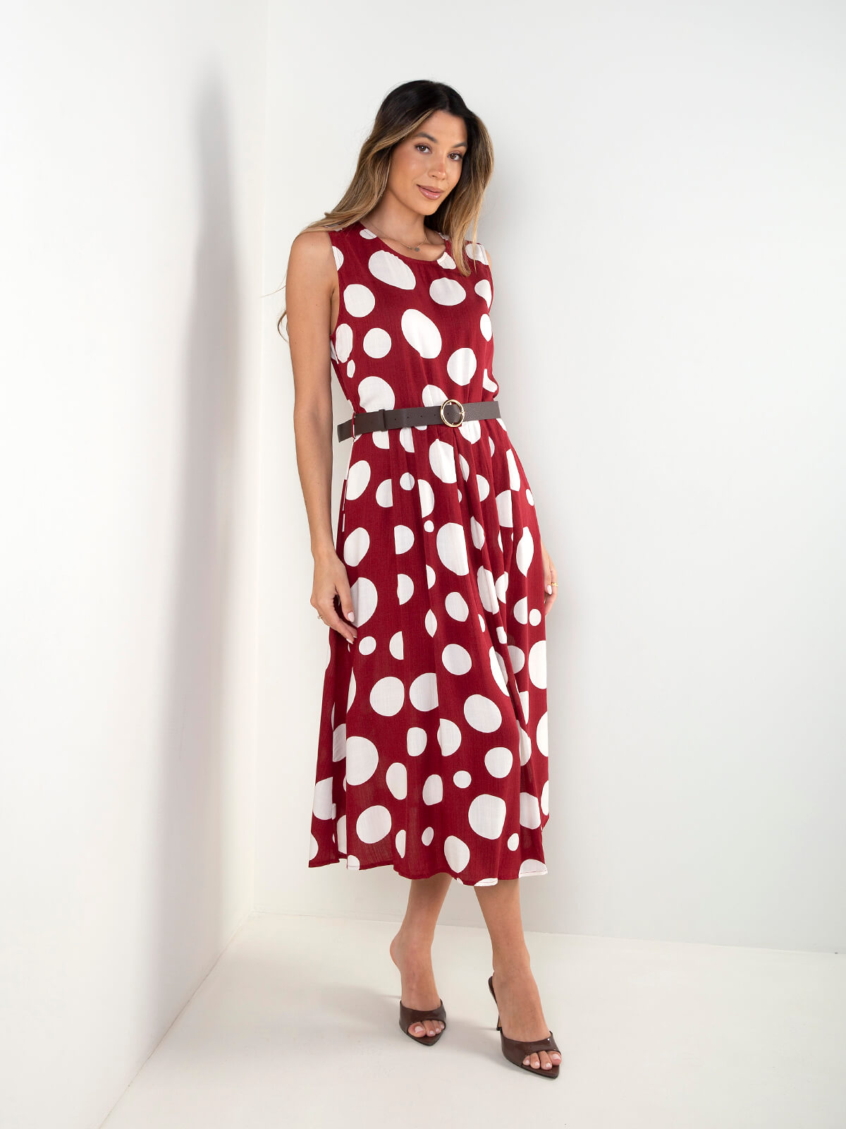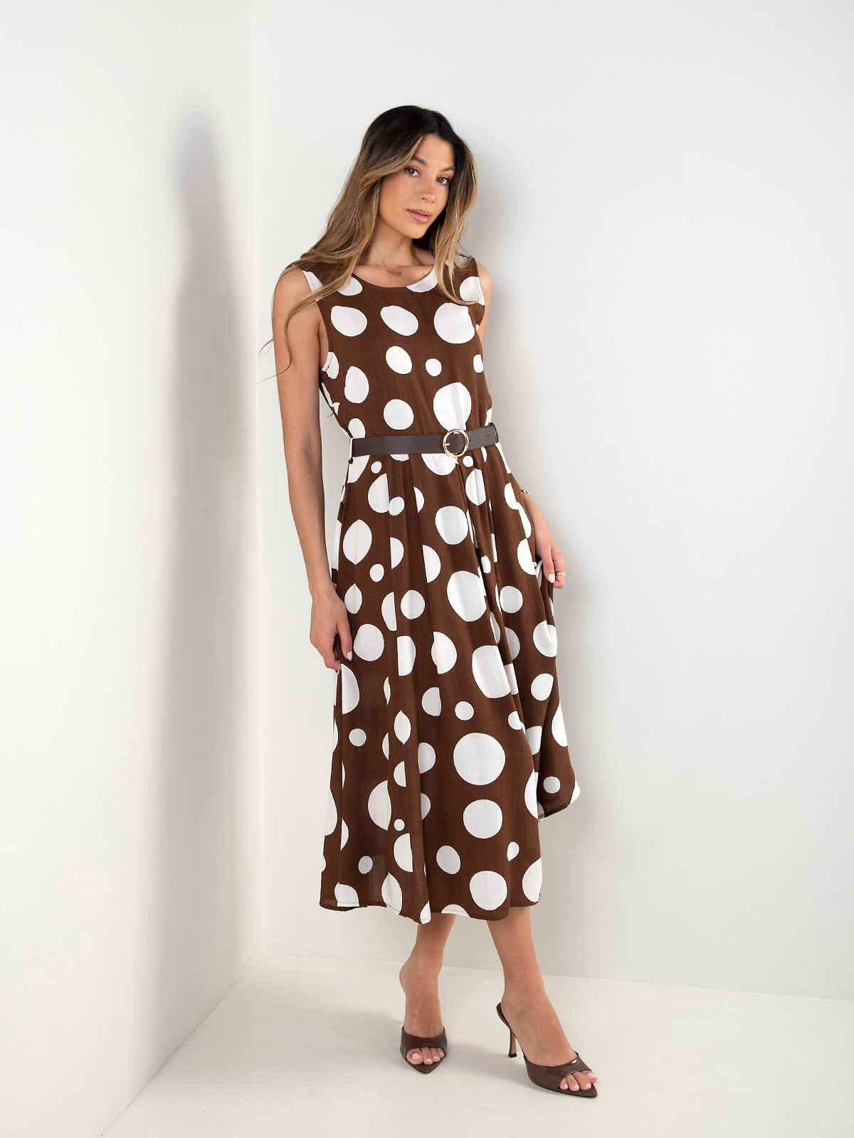 Vestido midi às bolas, sem mangas e com decote redondo. Cintura ajustável com cinto e saia fluida com movimento. Ideal para looks versáteis de dia ou ocasião.