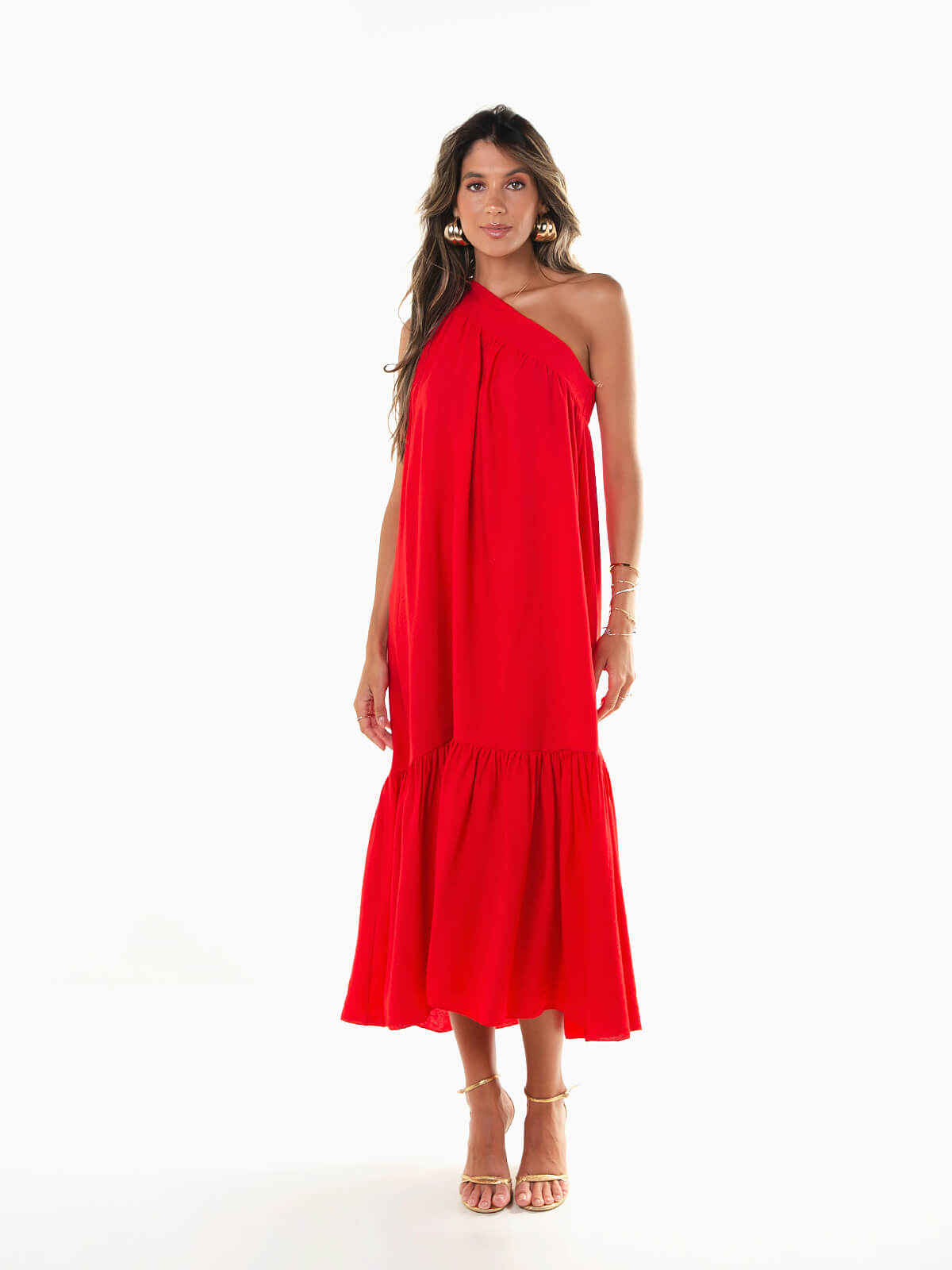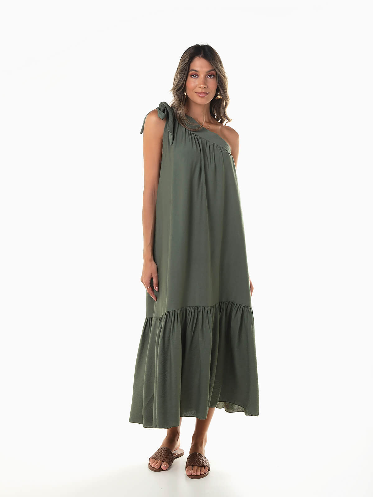 Vestido midi assimétrico com encaixe de folho na base. Vestido fluído para senhora com aperto de laço no ombro.