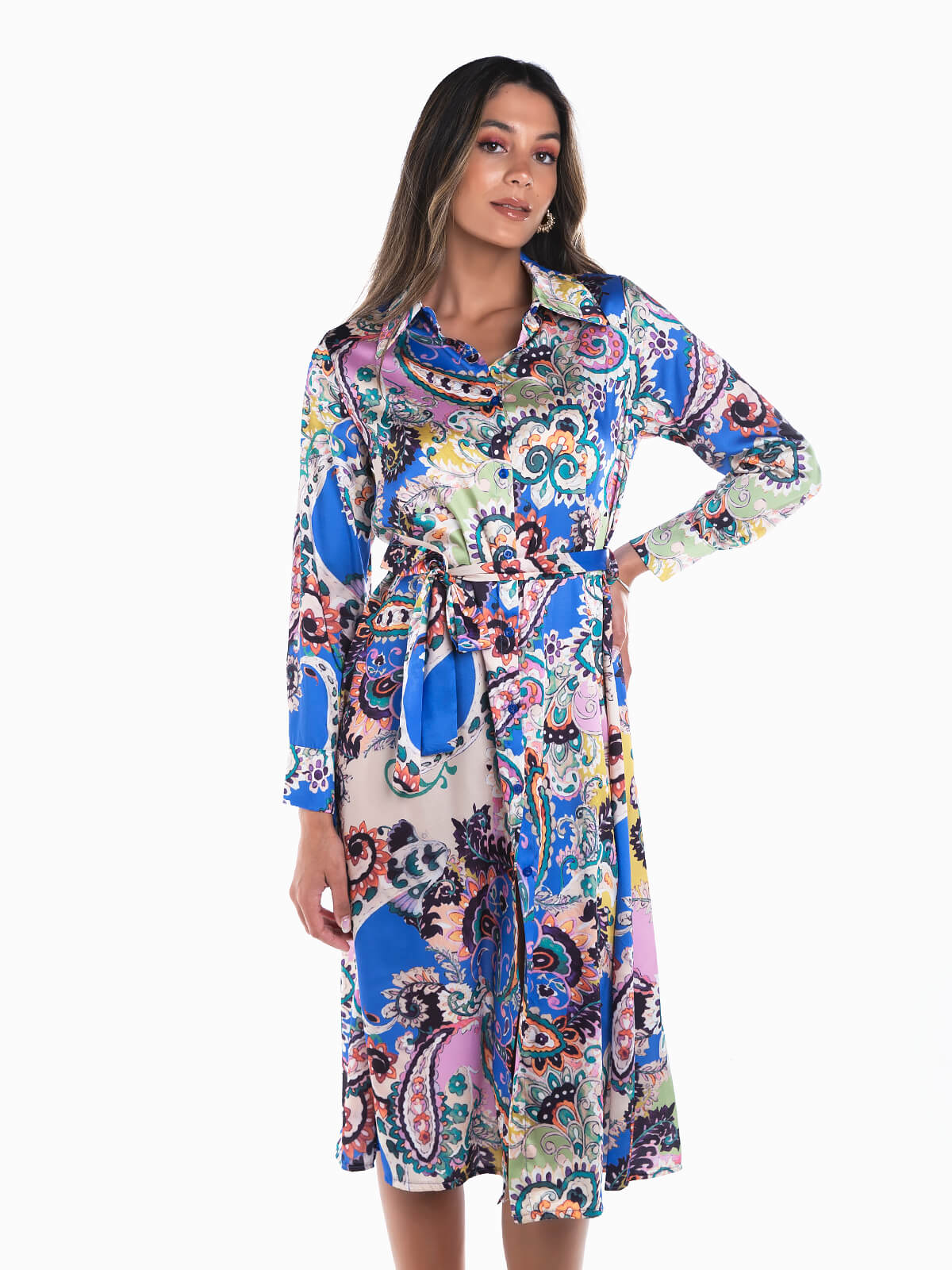 Vestido midi estilo camiseiro em tecido acetinado. Vestido de manga comprida com estampado étnico e punhos abotoados. Cinto no mesmo tecido para ajustar. Aperto frontal de botões.