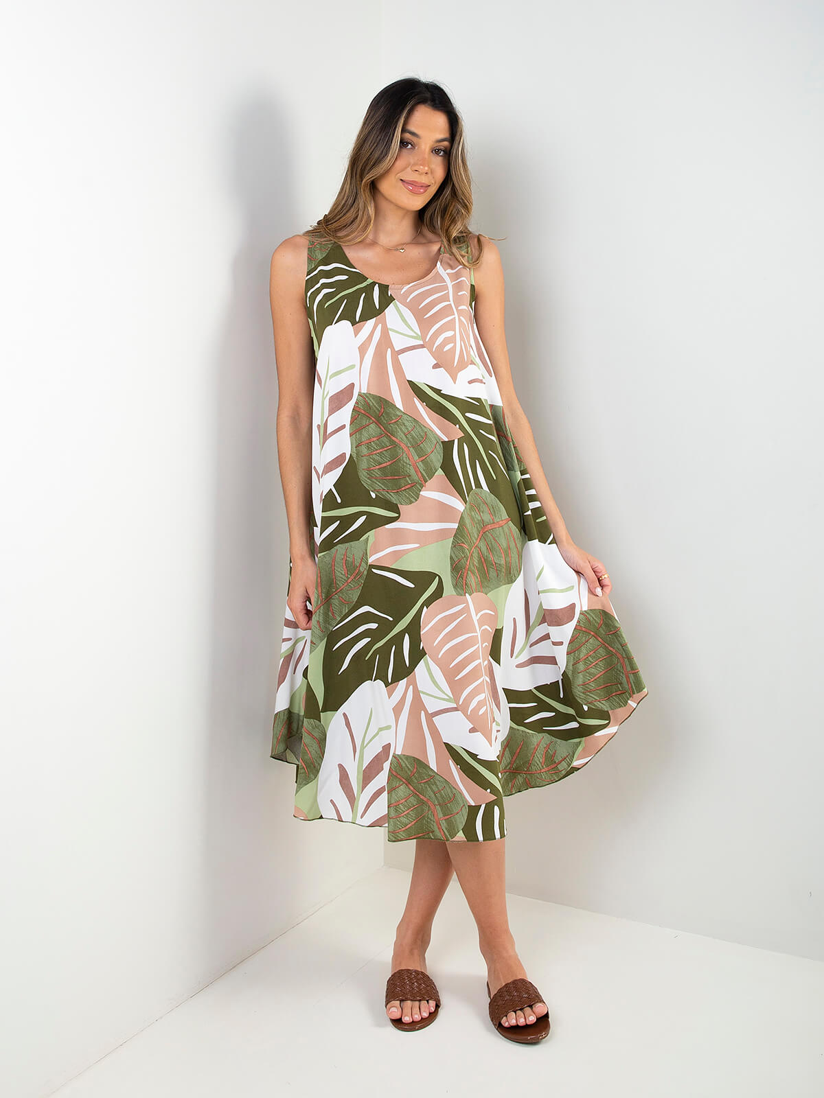Vestido midi com estampado tropical, leve e fluido. Modelo confortável que acompanha o movimento, ideal para looks frescos e descontraídos nos dias mais quentes.