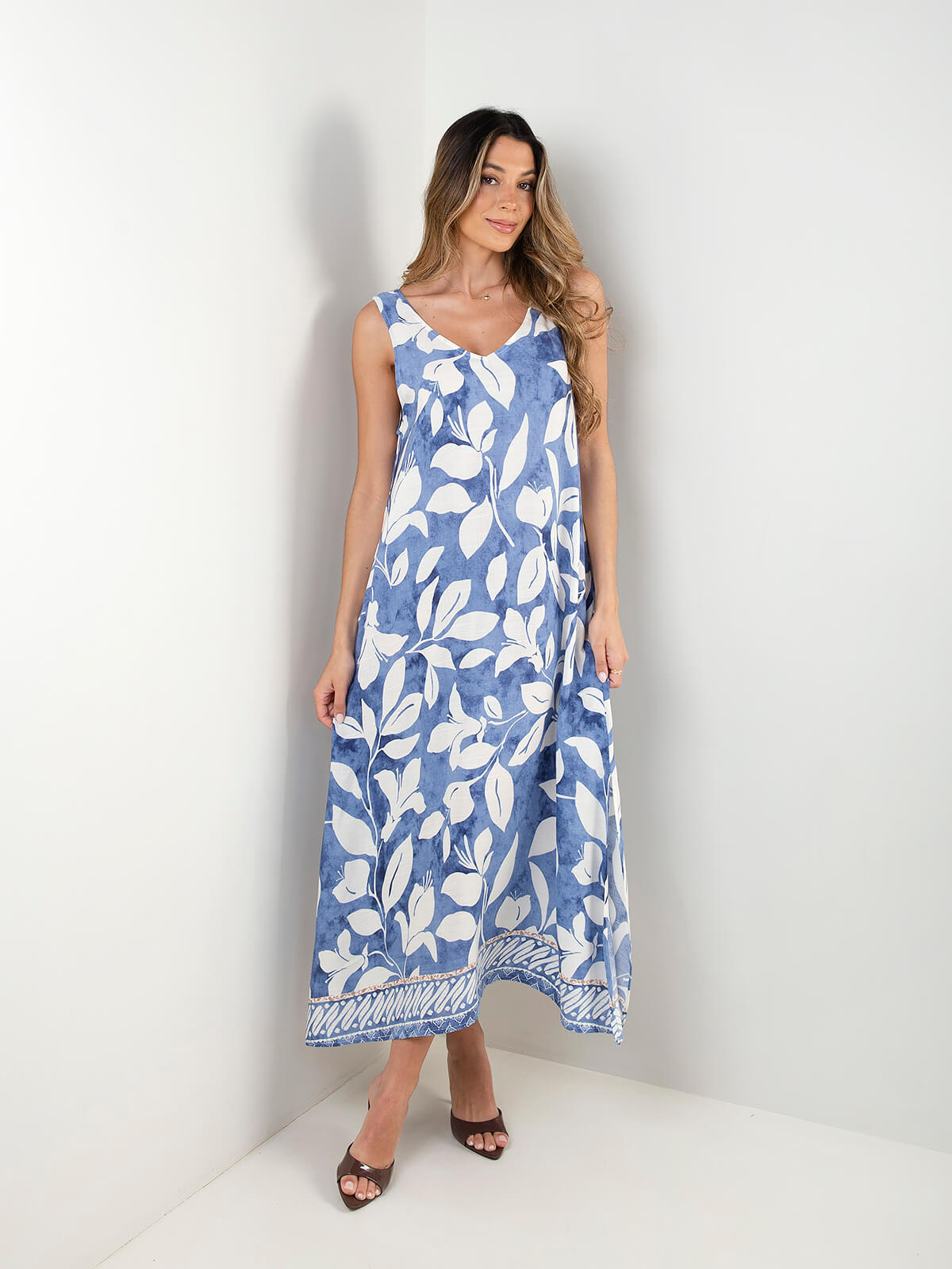Vestido midi com estampado, ideal para looks leves e descontraídos. Modelo com alças largas e decote em V, de corte fluído que garante conforto e liberdade de movimentos. Perfeito para os dias mais quentes.