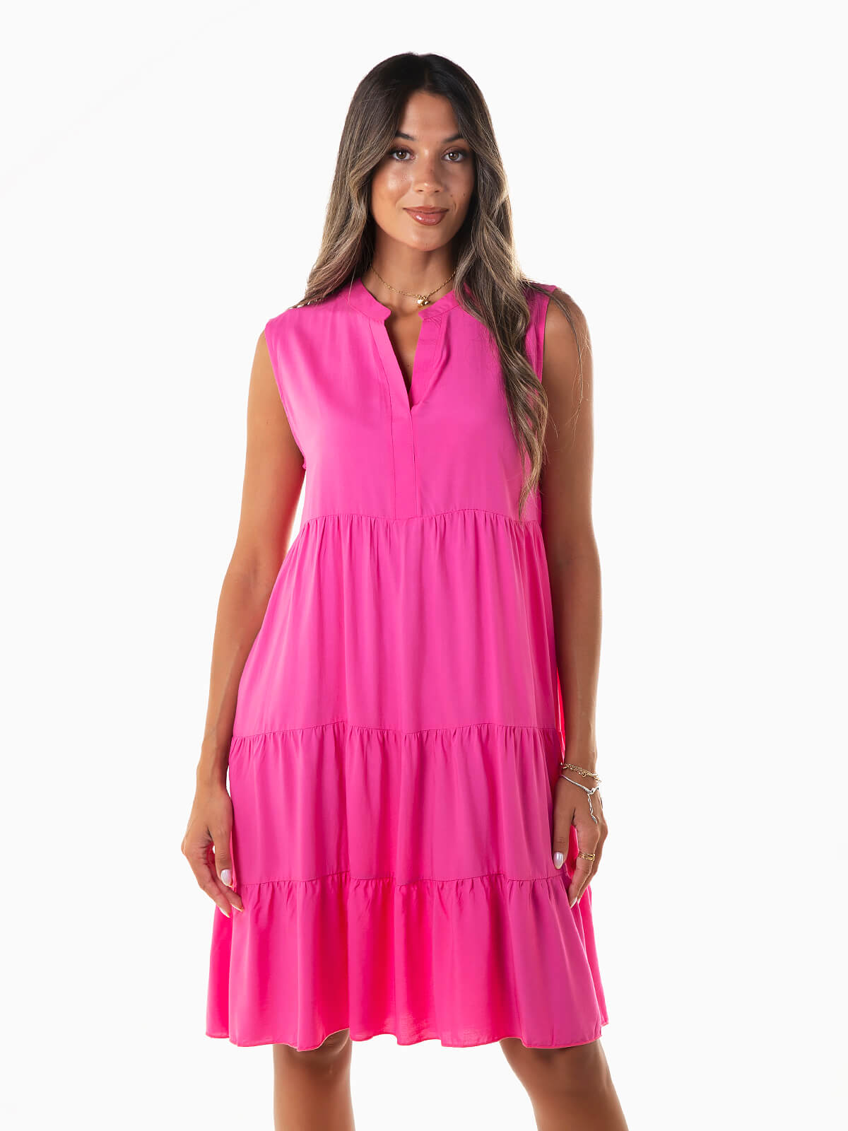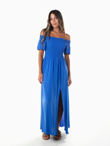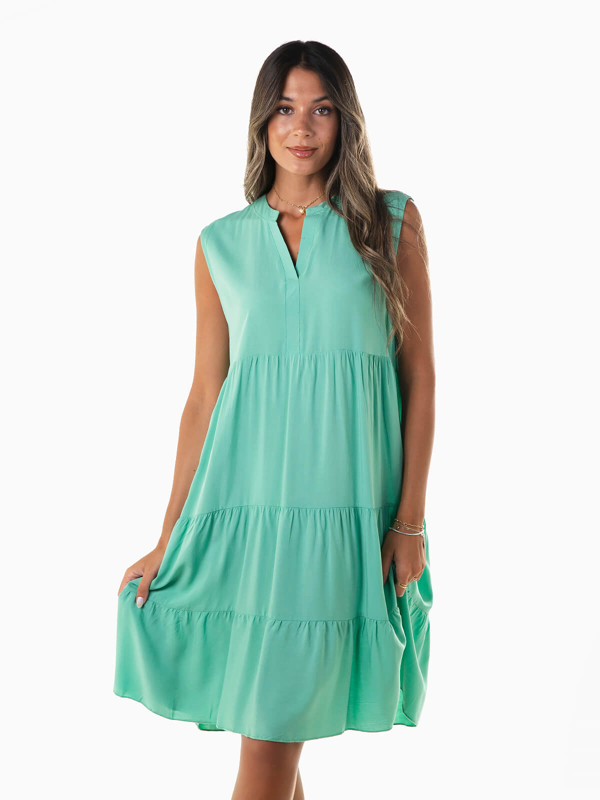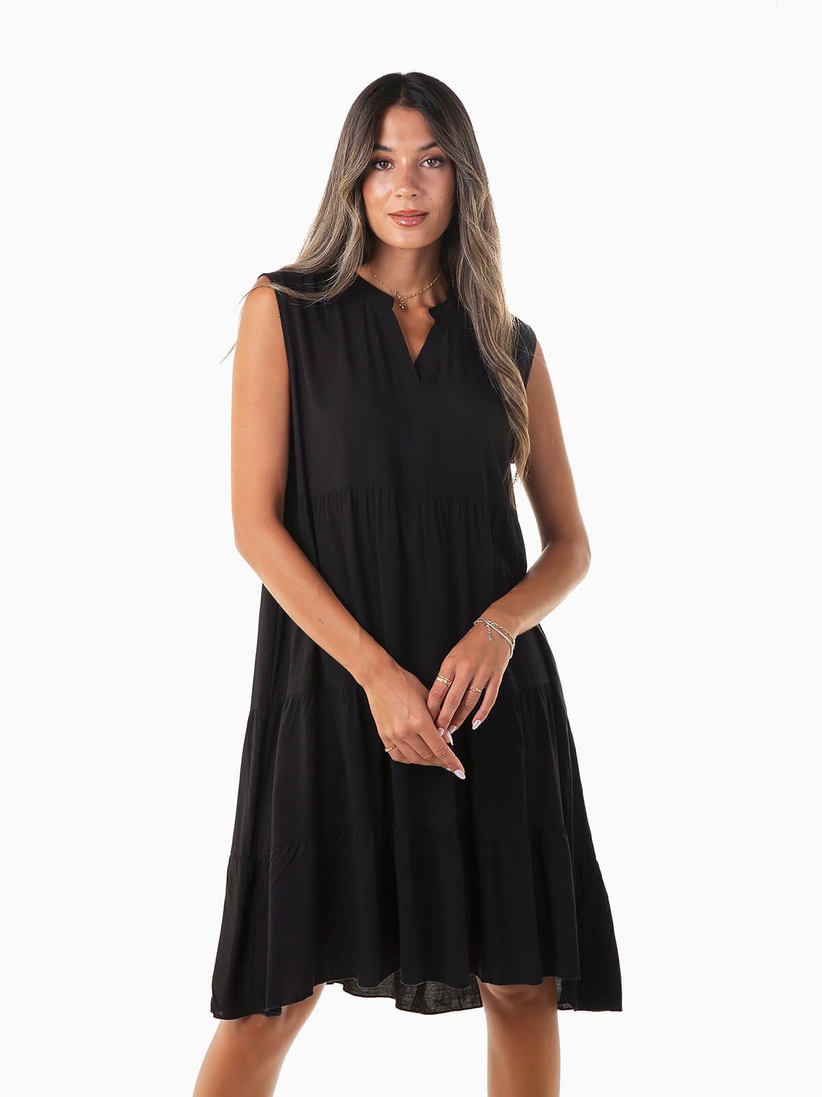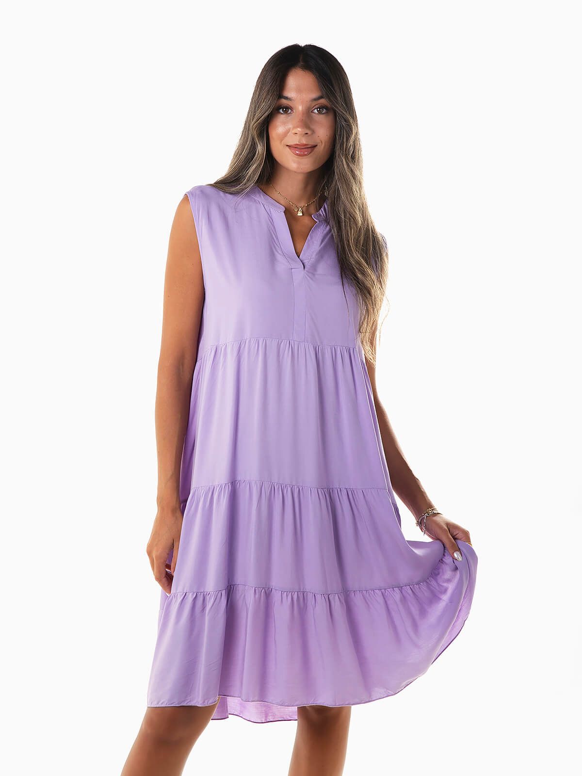 Vestido midi fluído com encaixe de folhos para senhora. Vestido manga cava confeccionado em tecido 100% algodão para maior conforto. Gola mao e abertura em V. Altura da Modelo: 175 cm | Tamanho: M/L