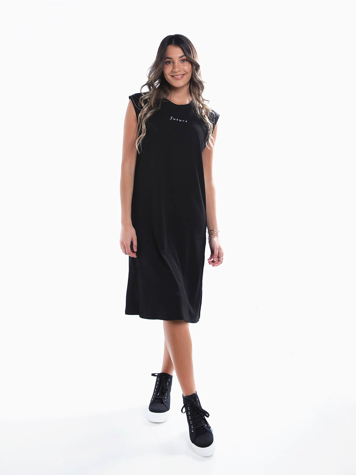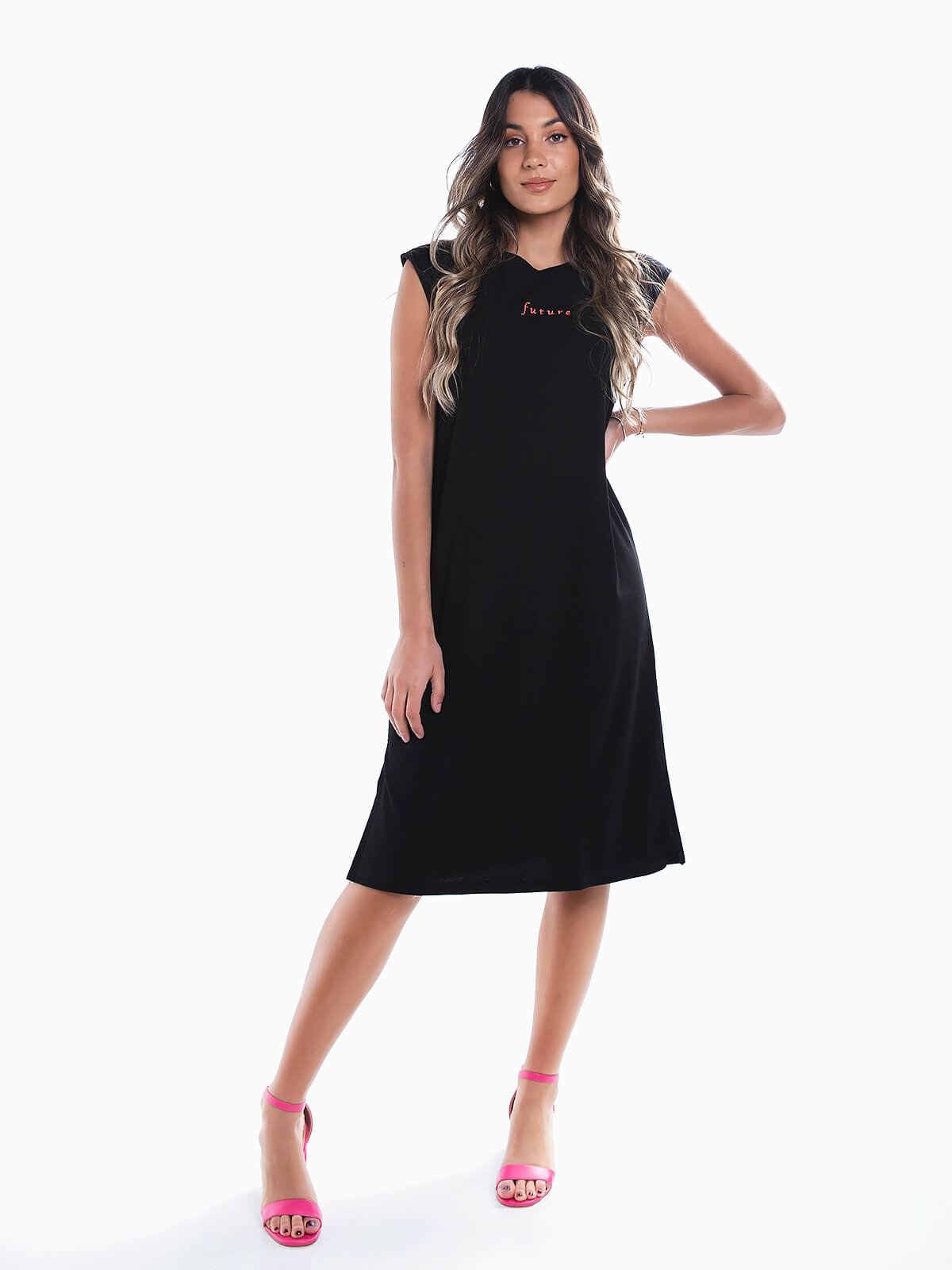 Vestido midi de malha fina para senhora. Vestido sem mangas com bordado no peito. Gola redonda. Aberturas na base.