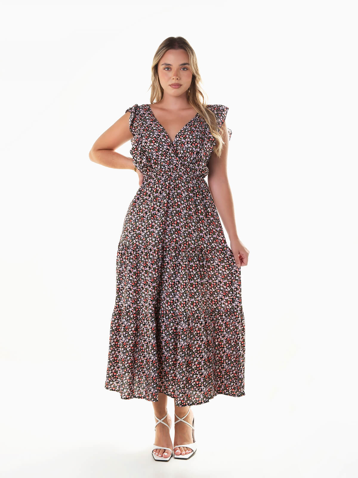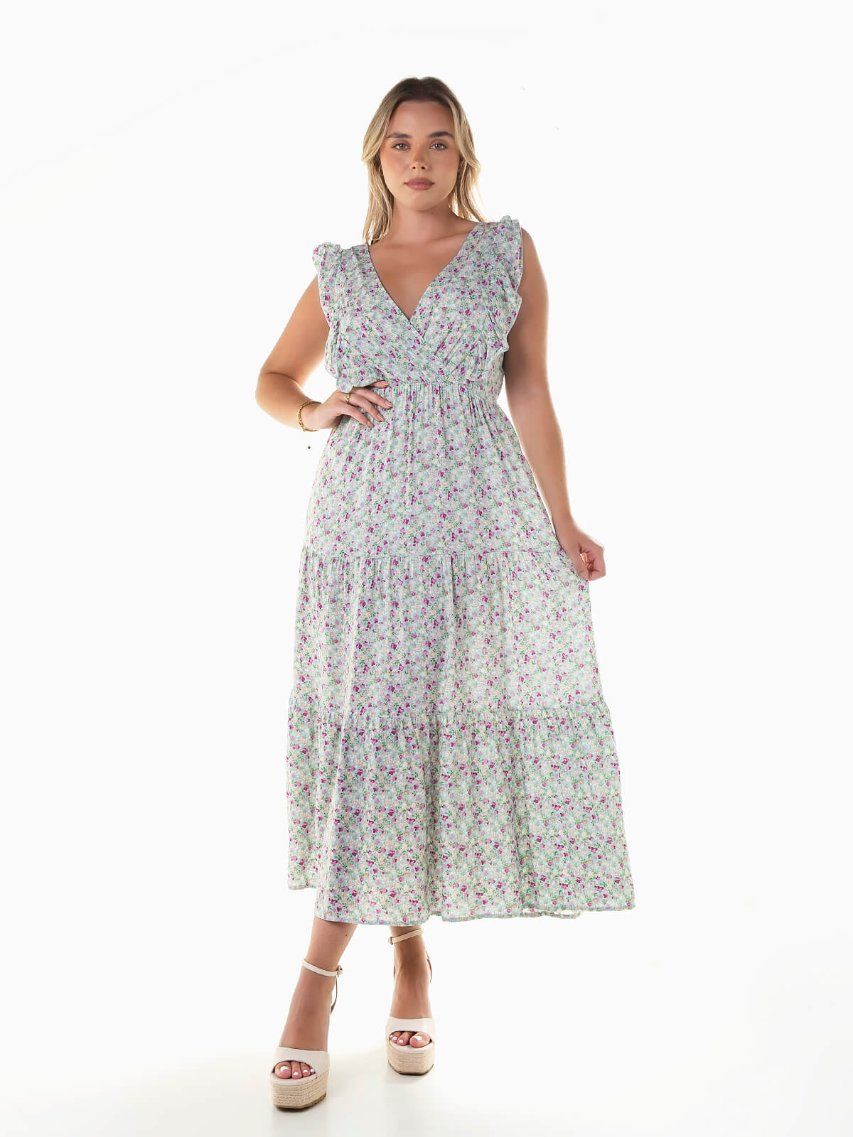 Vestido midi com estampado floral para senhora. Vestido fluído sem mangas com folhos aplicados. Decote cruzado à frente e atrás. Cintura elástica.