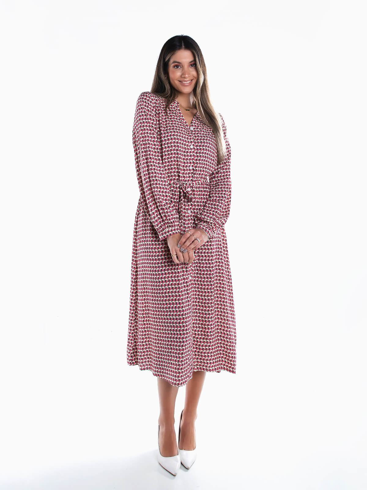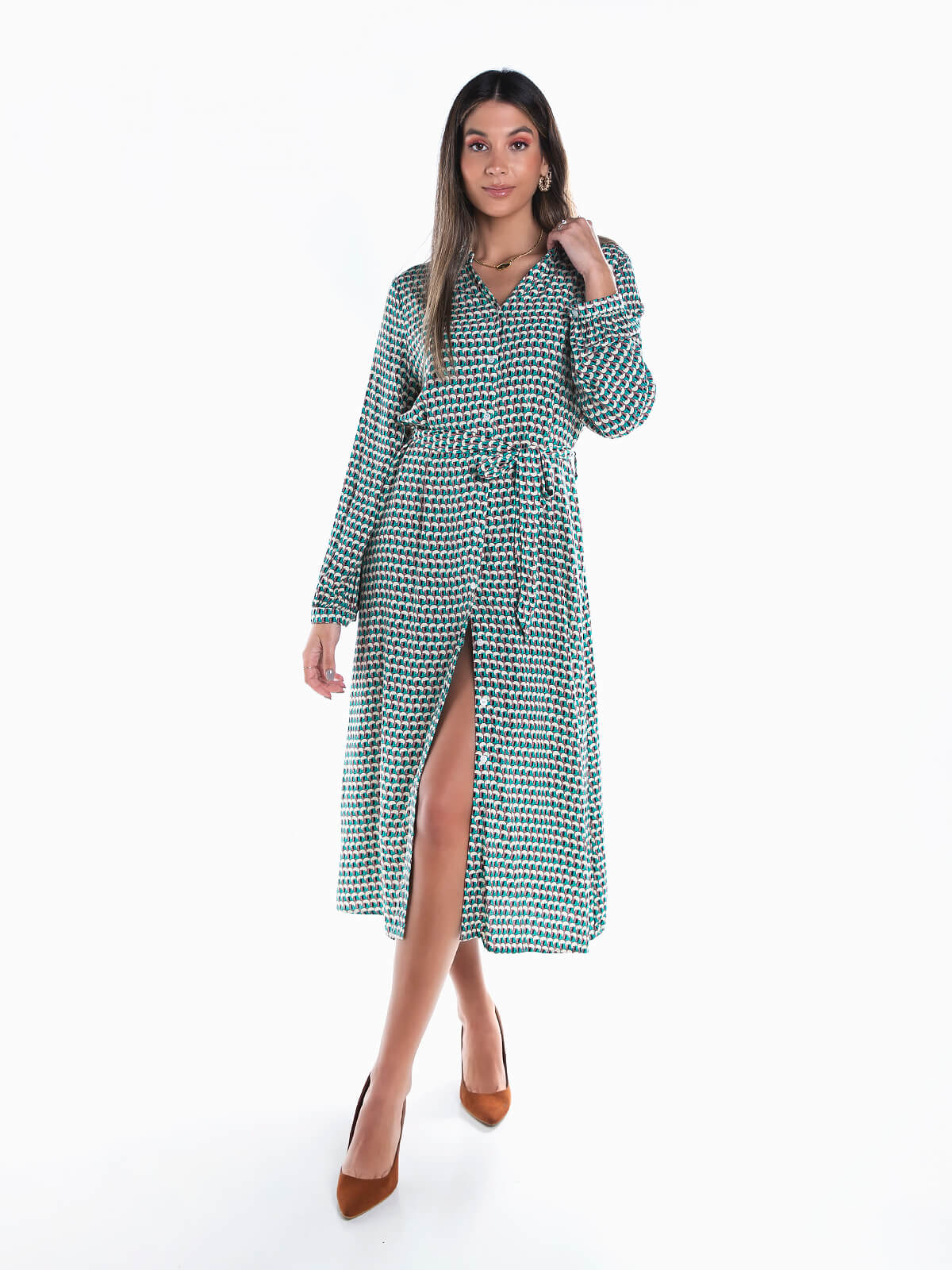 Vestido midi com estampado geométrico para senhora. Vestido de manga comprida com cinto removível. Punhos abotoados. Decote em bico. Aperto frontal de botões.
