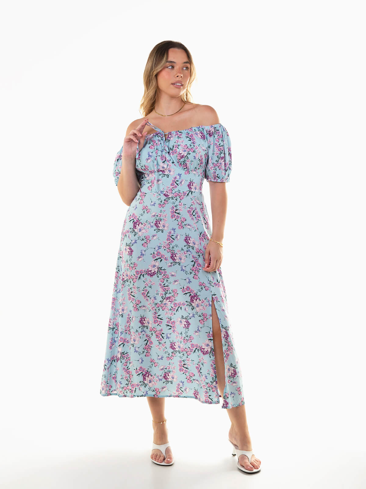 Vestido midi de corte fluído com decote barco, cordão para ajustar e estampado floral. A cintura marcada realça a silhueta, enquanto o tecido leve confere movimento ao look. Manga curta abalonada. Uma peça feminina e elegante com abertura na base, ideal para um visual descontraído com um toque romântico.