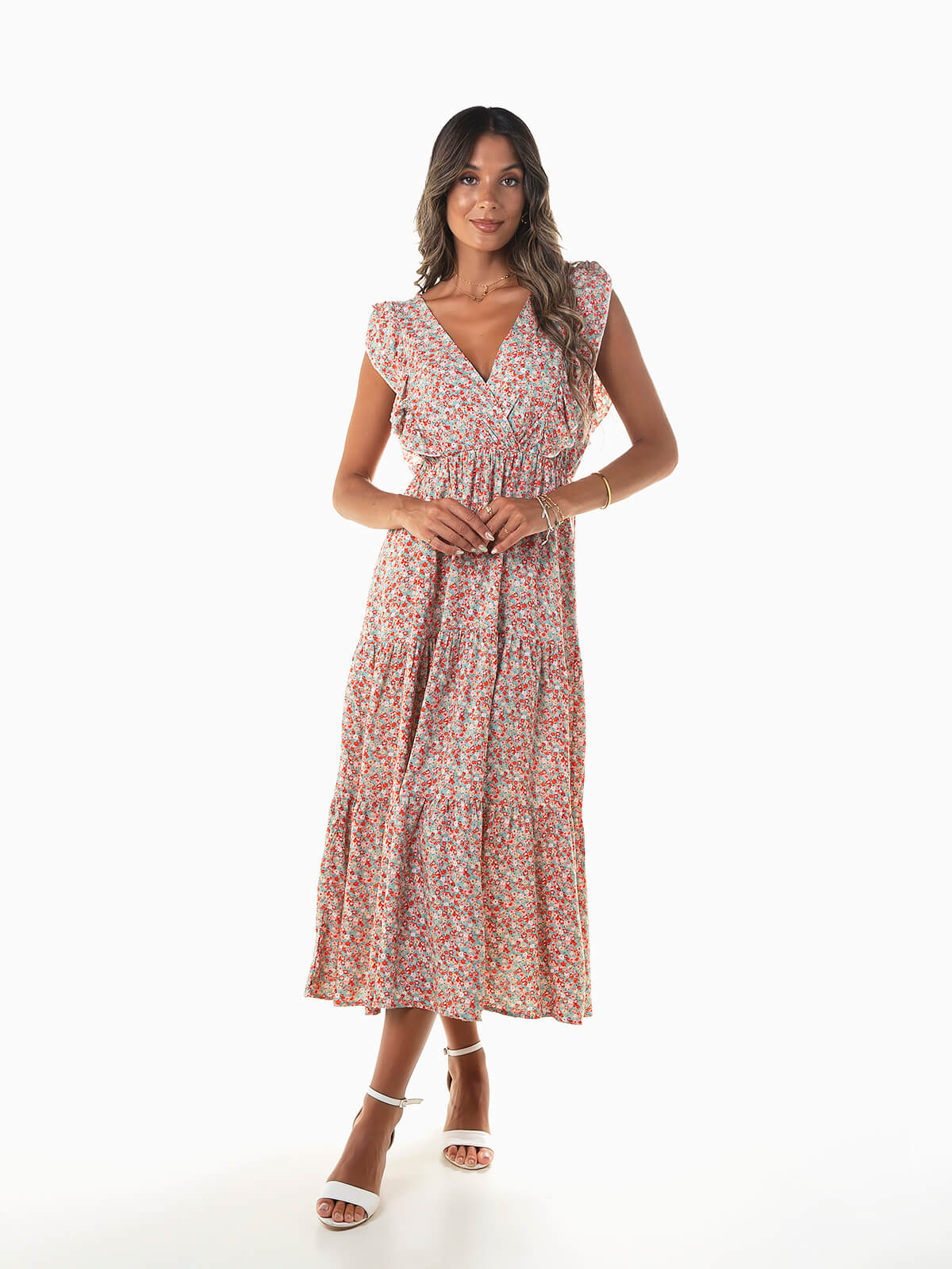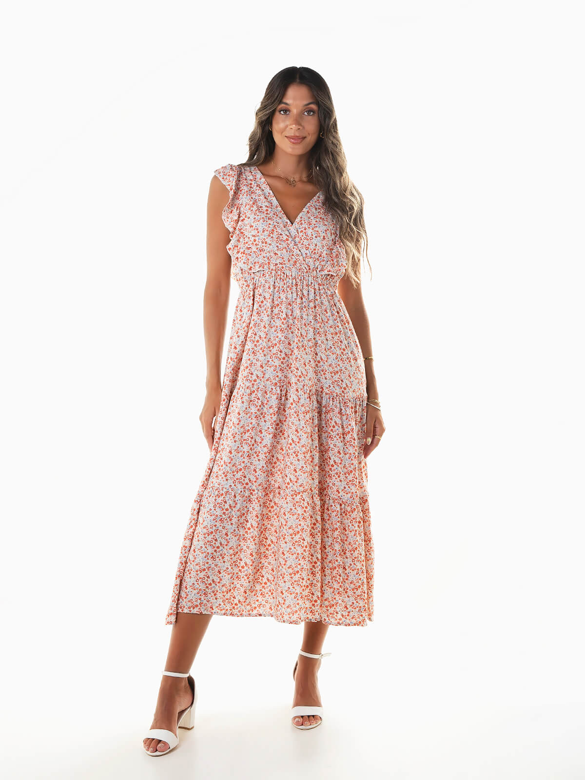 Vestido midi estampado floral com decote cruzado à frente e atrás. Vestido fluído em tecido 100% algodão com folhos aplicados. Cintura elástica.