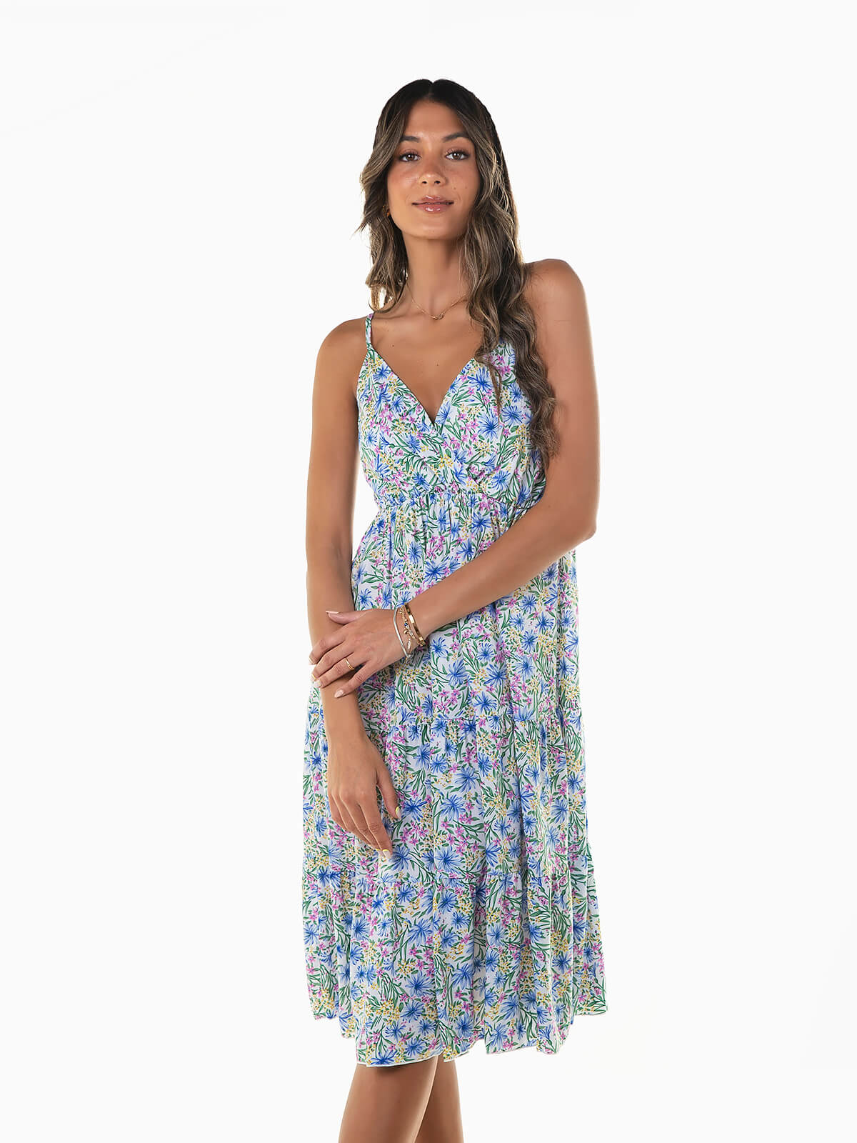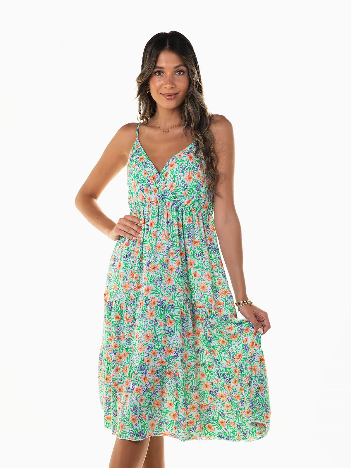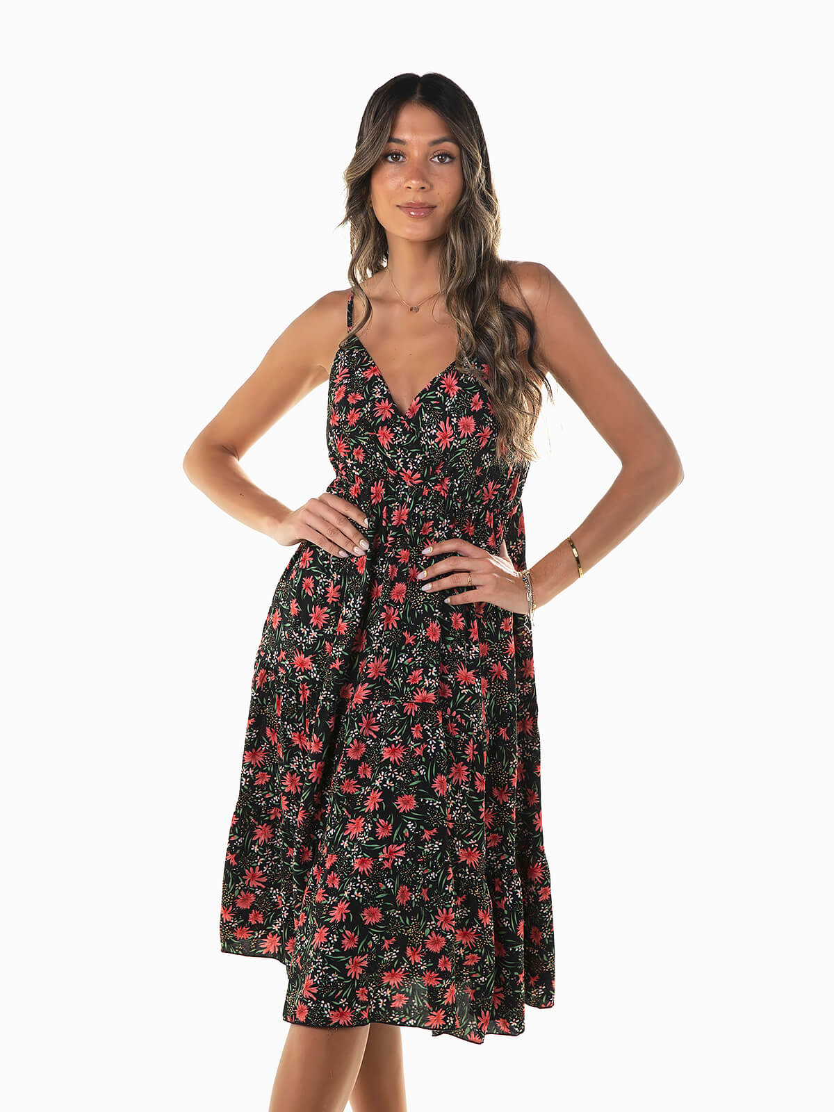 Vestido midi floral de corte fluído com encaixe folhos. Vestido alças finas reguláveis com decote cruzado e cintura elástica.