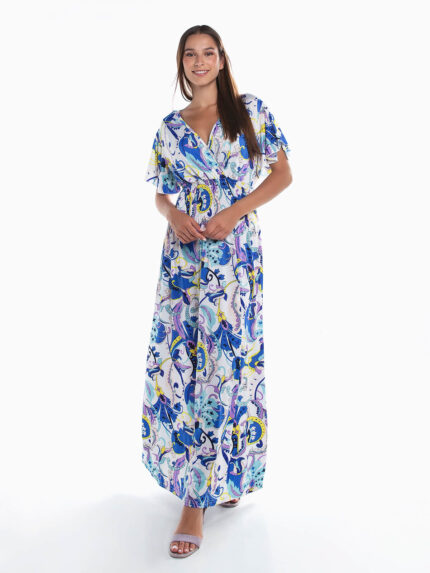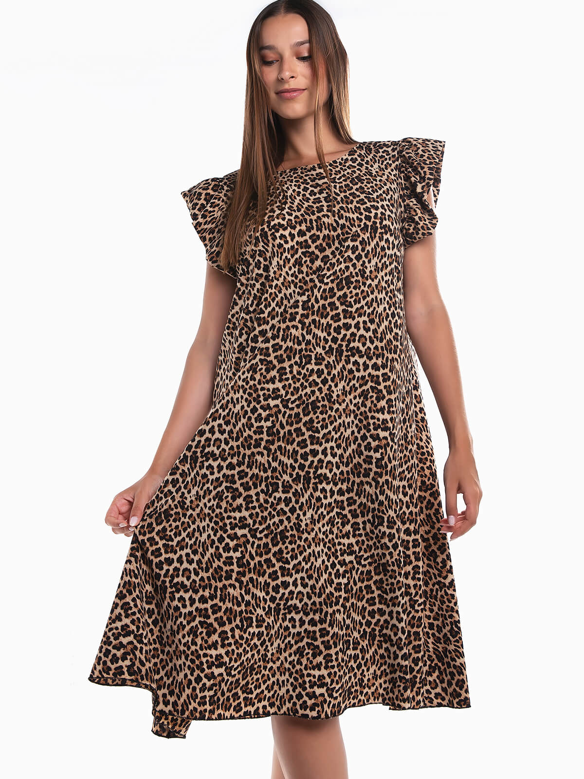 Vestido midi fluído animal print com costas abertas e fio de pérolas aplicado. Vestido largo sem mangas com encaixe de folho na cava. Decote redondo.