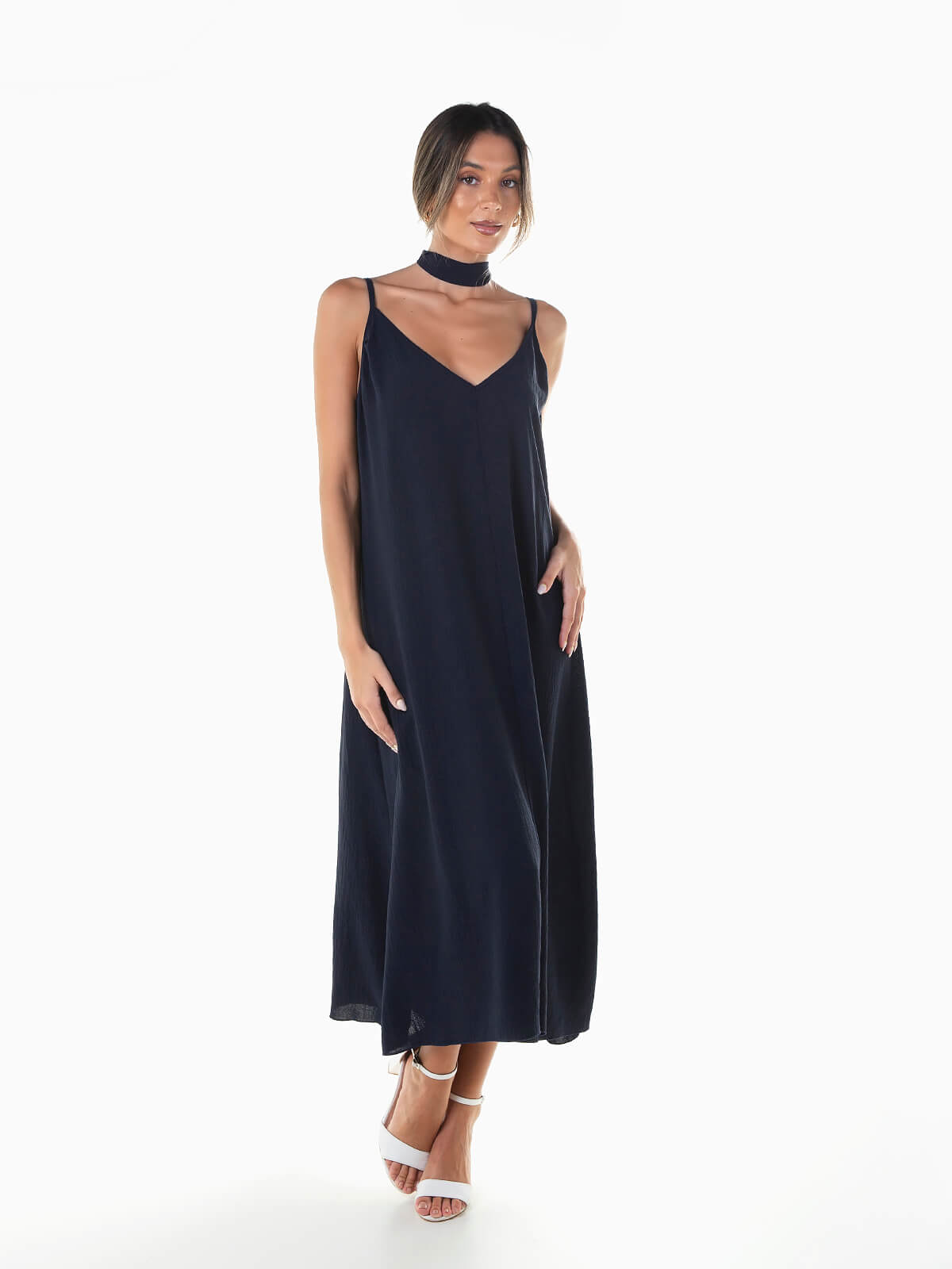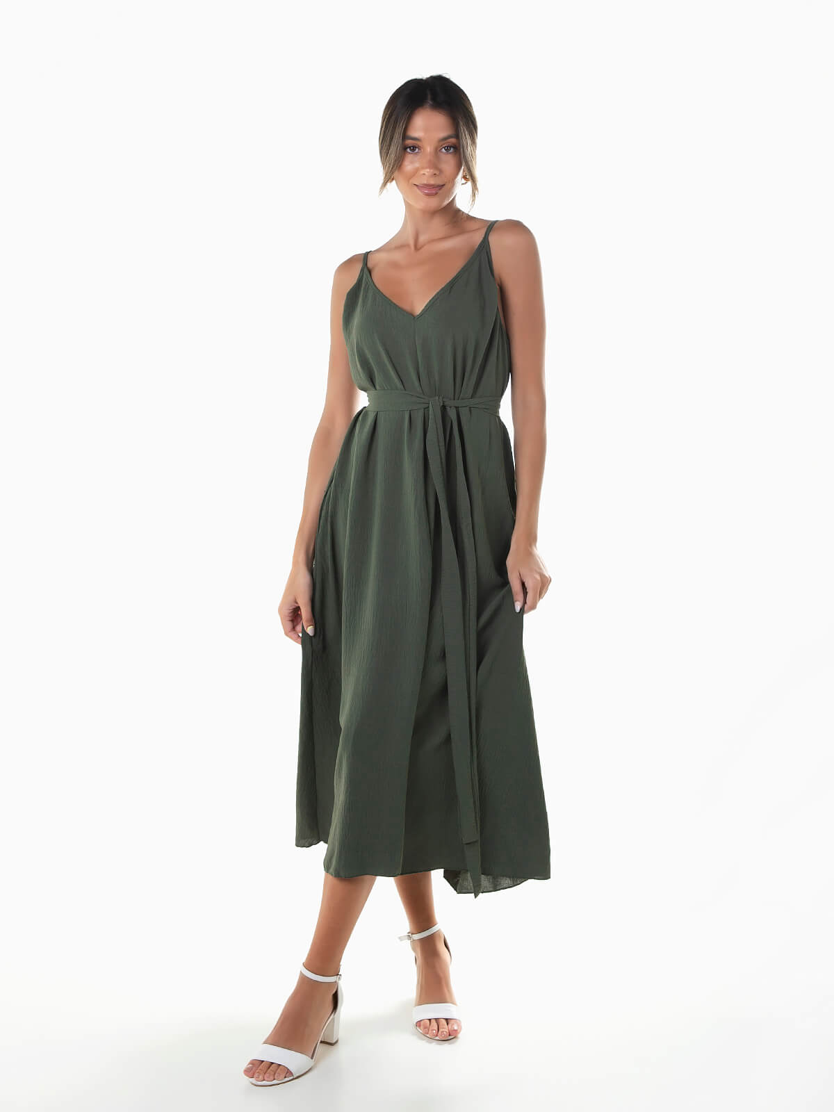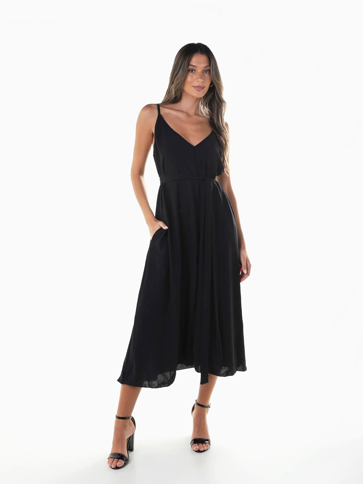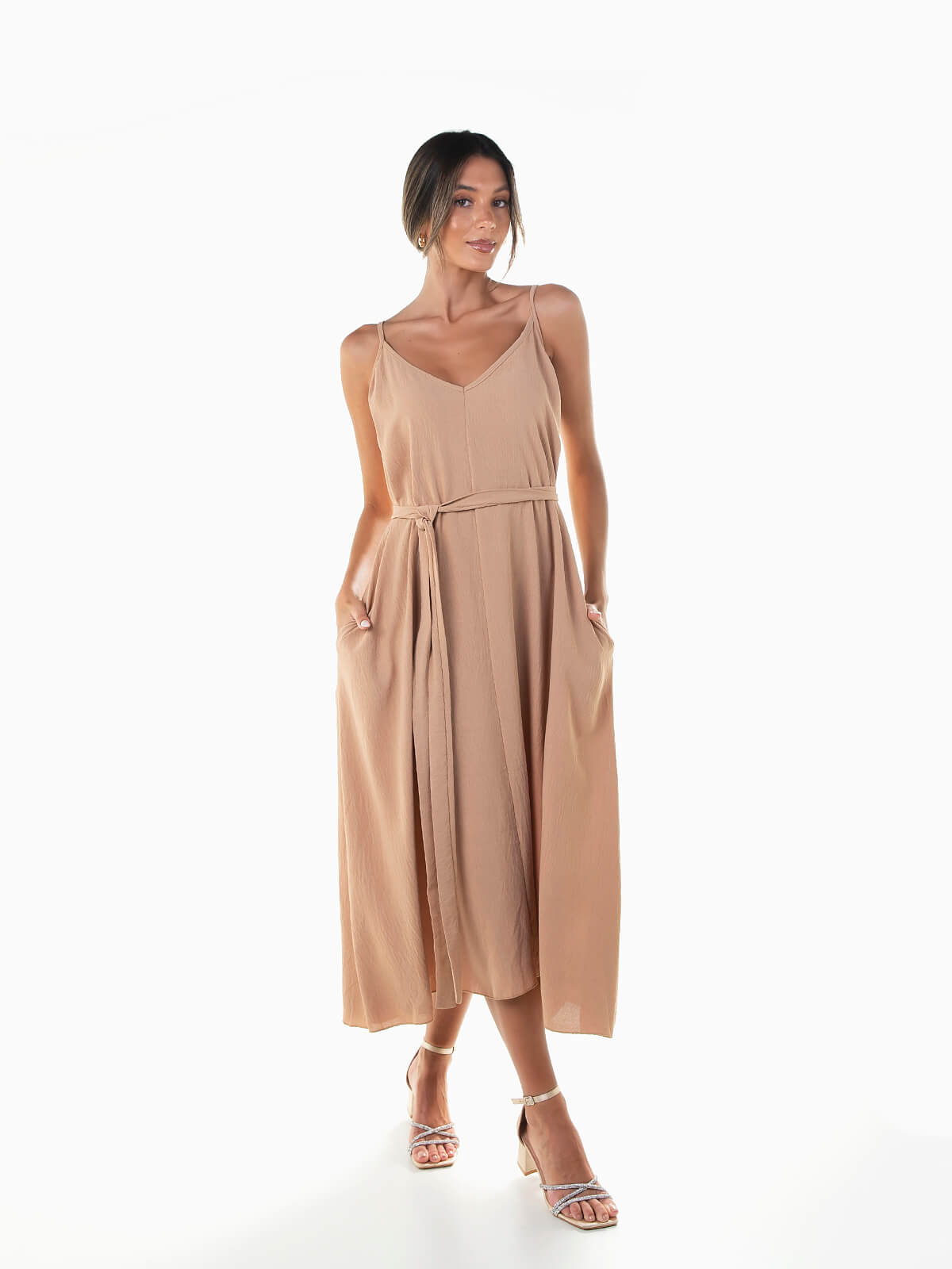 Vestido midi fluído de corte evasé para senhora com cinto amovível. Vestido alças finas com decote em V e dois bolsos laterais.