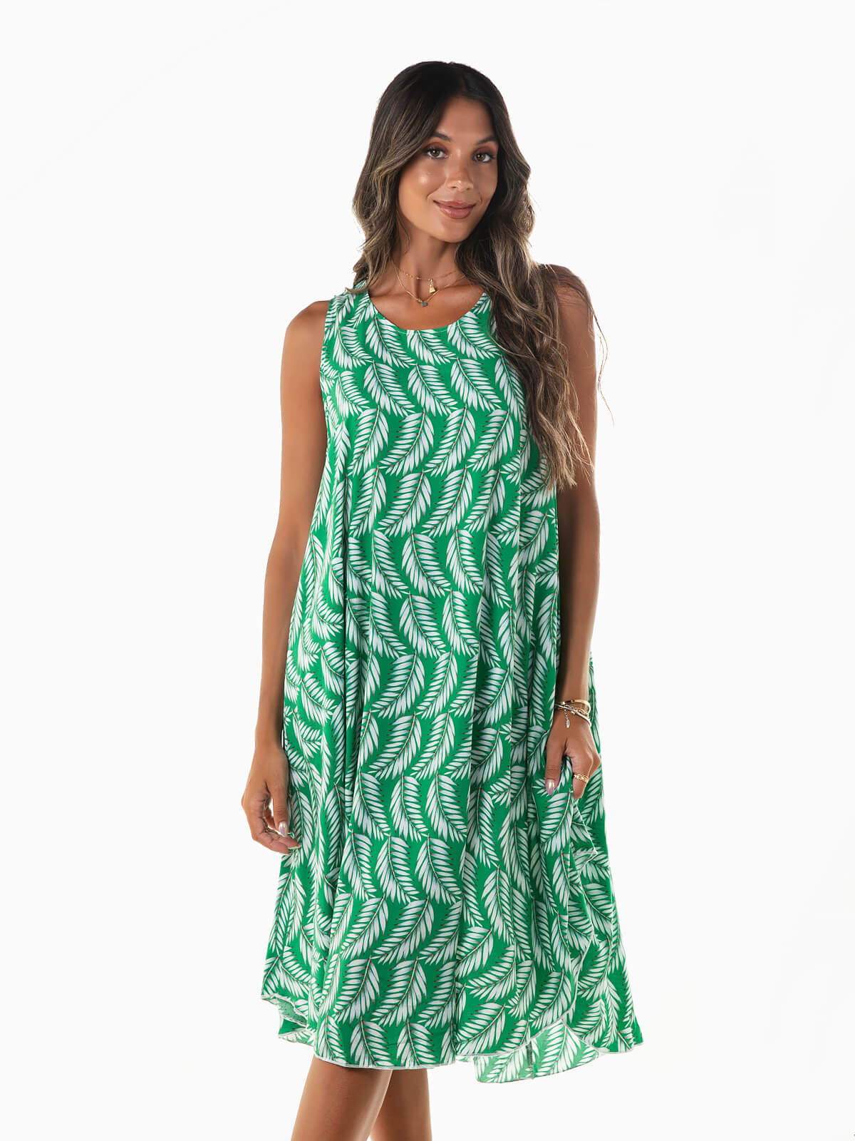 Vestido midi fluído com estampado de folhas para senhora. Vestido leve e fresco de corte evasé com alças largas e decote redondo.