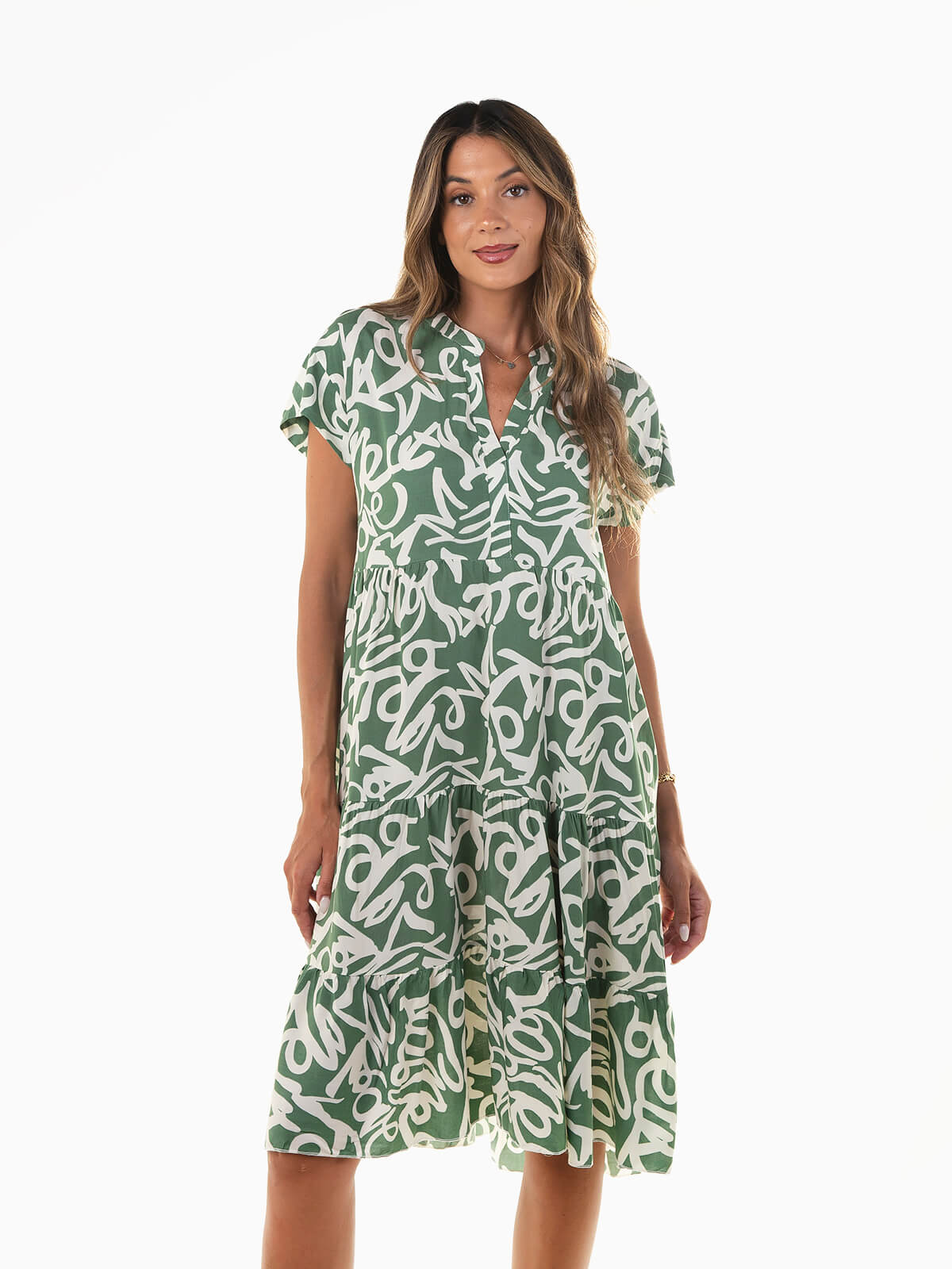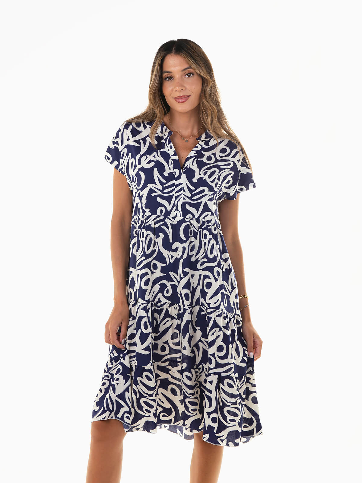 Vestido midi fluído em viscose para maior conforto. Vestido de manga curta com painéis, gola mao e abertura em V. Padrão abstrato em contraste.