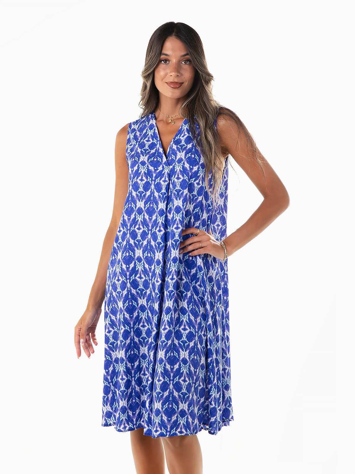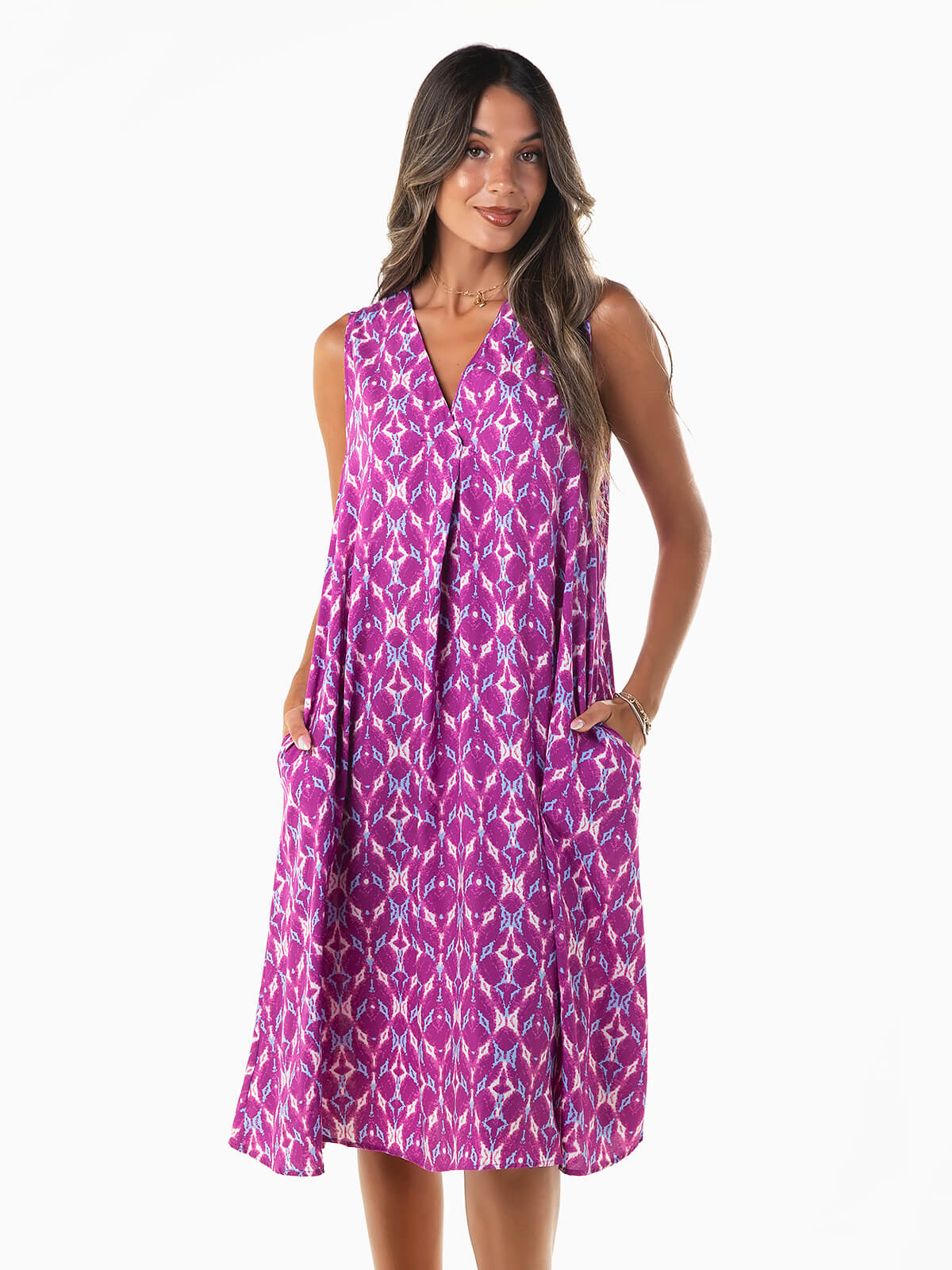 Vestido midi largo com estampado étnico para senhora. Vestido sem mangas confecionado em tecido 100% algodão, leve e fresco com corte evasé e 2 bolsos. Decote em V.