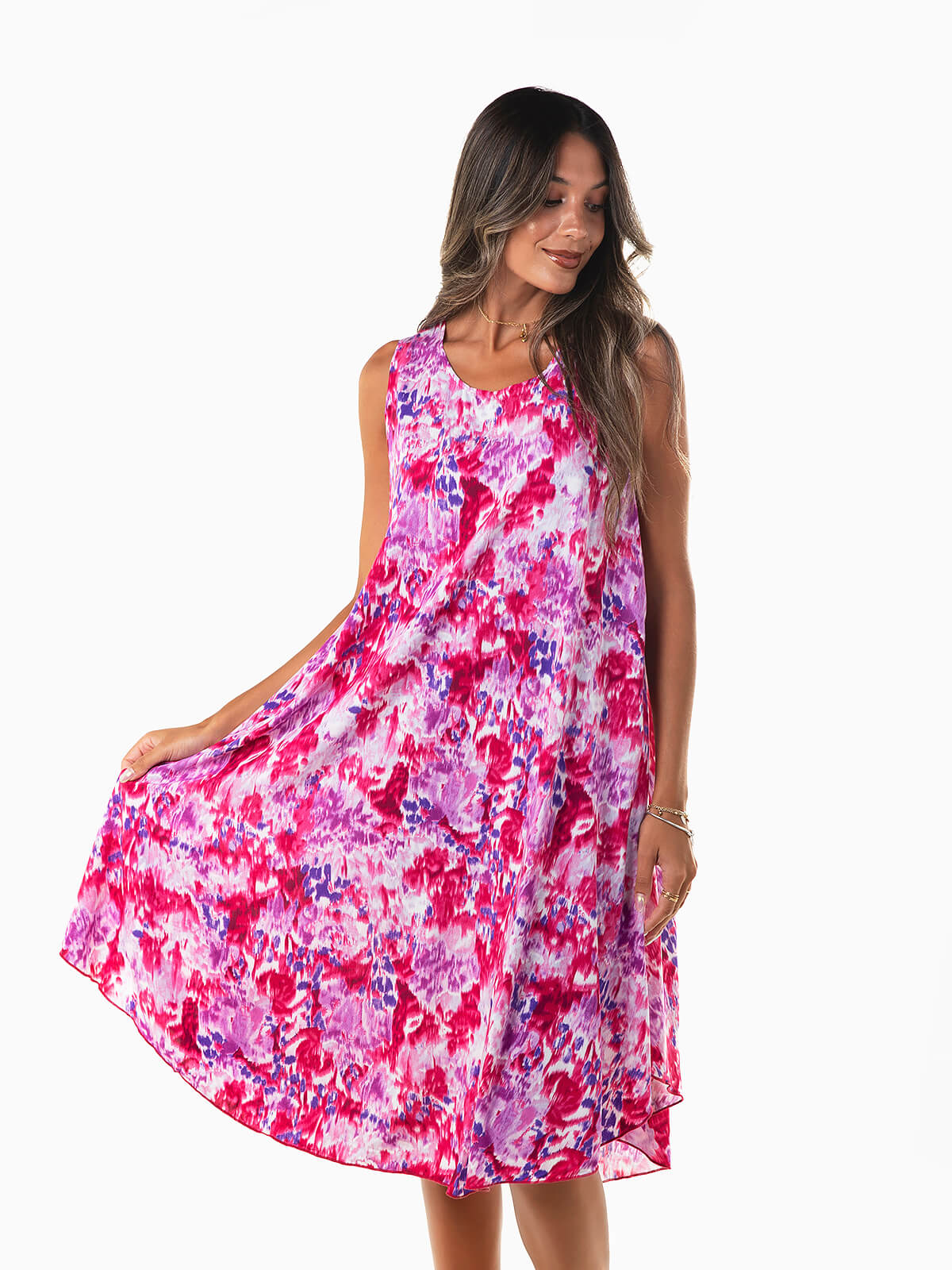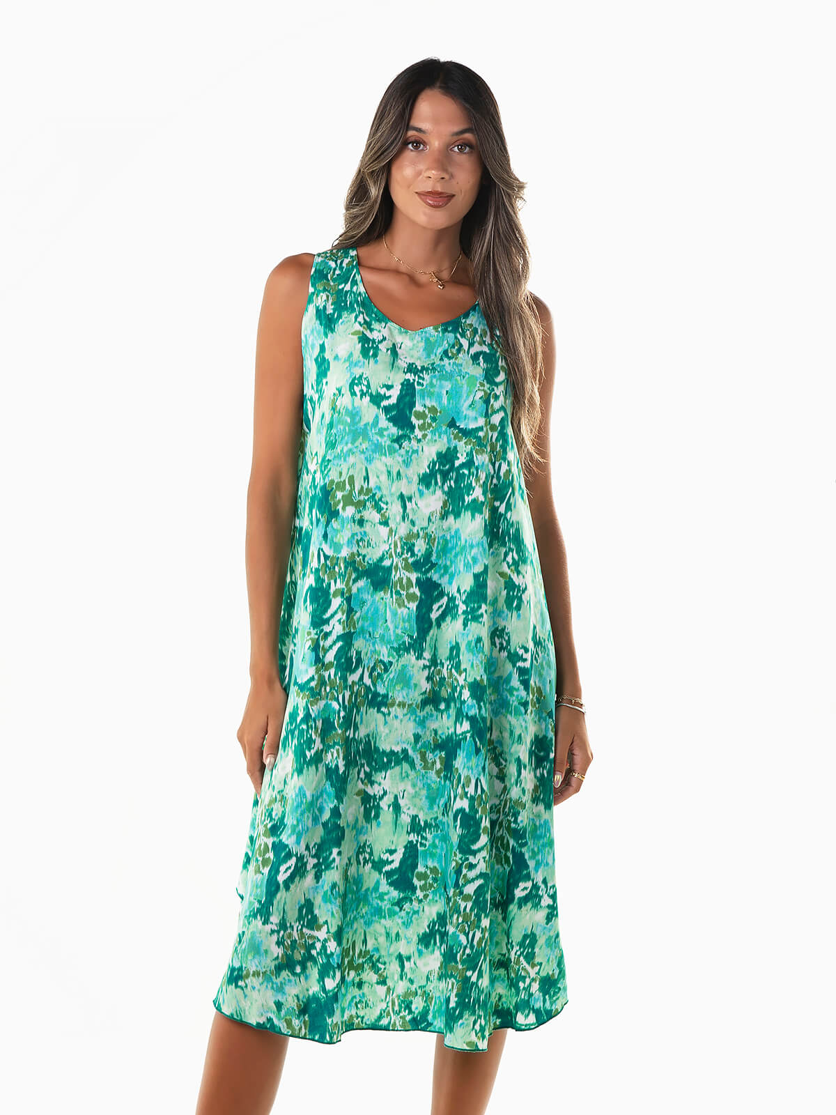 Vestido midi largo com estampado manchado para senhora. Vestido alças confecionado em tecido 100% algodão, leve e fresco com corte evasé e cós arredondado. Decote redondo.