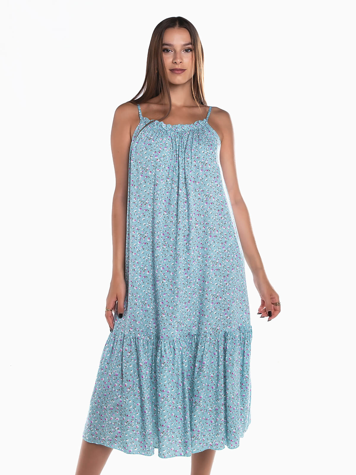 Vestido midi fluído com estampado floral para senhora. Vestido de alças com encaixe folho na base. Decote redondo.