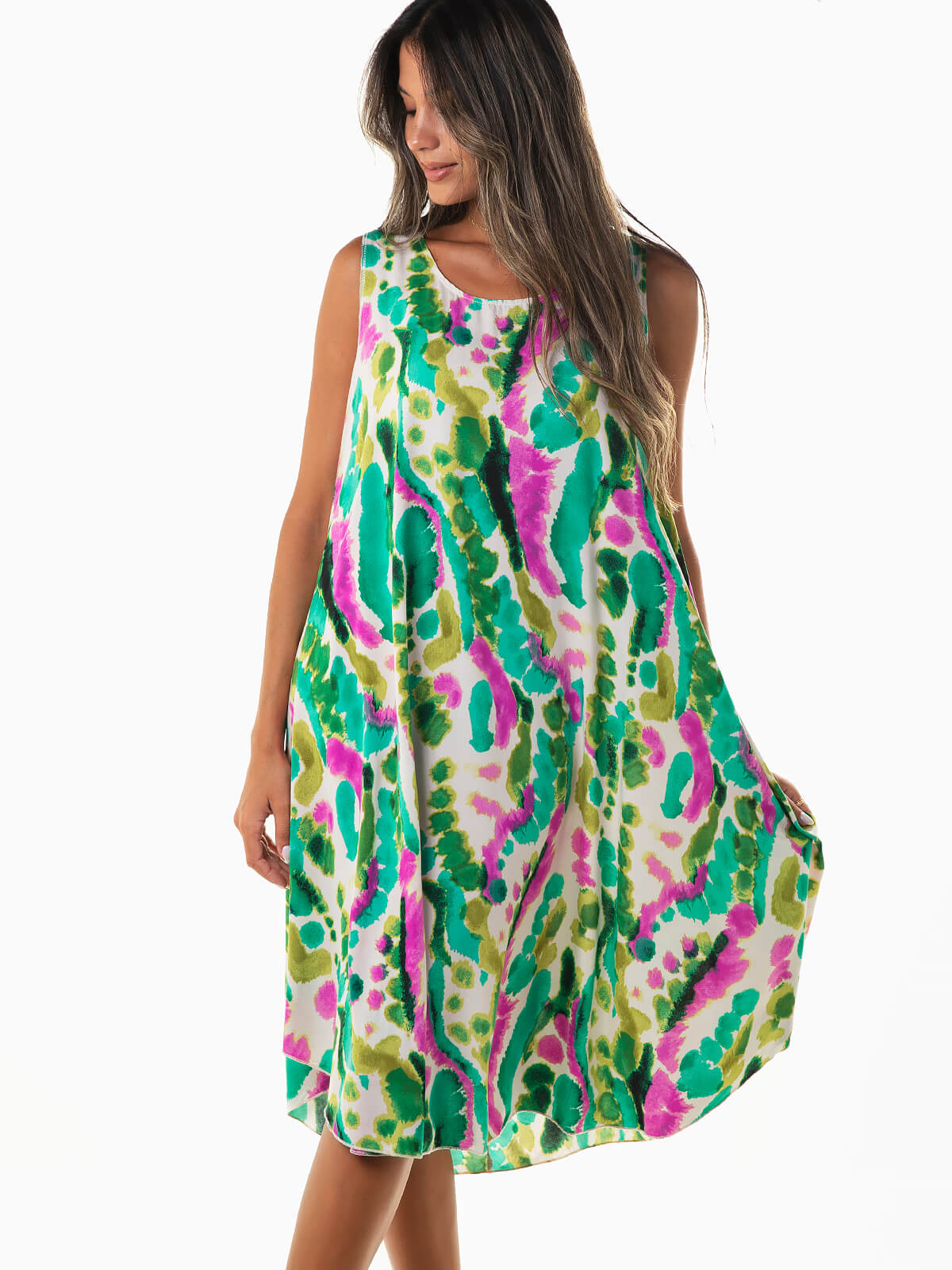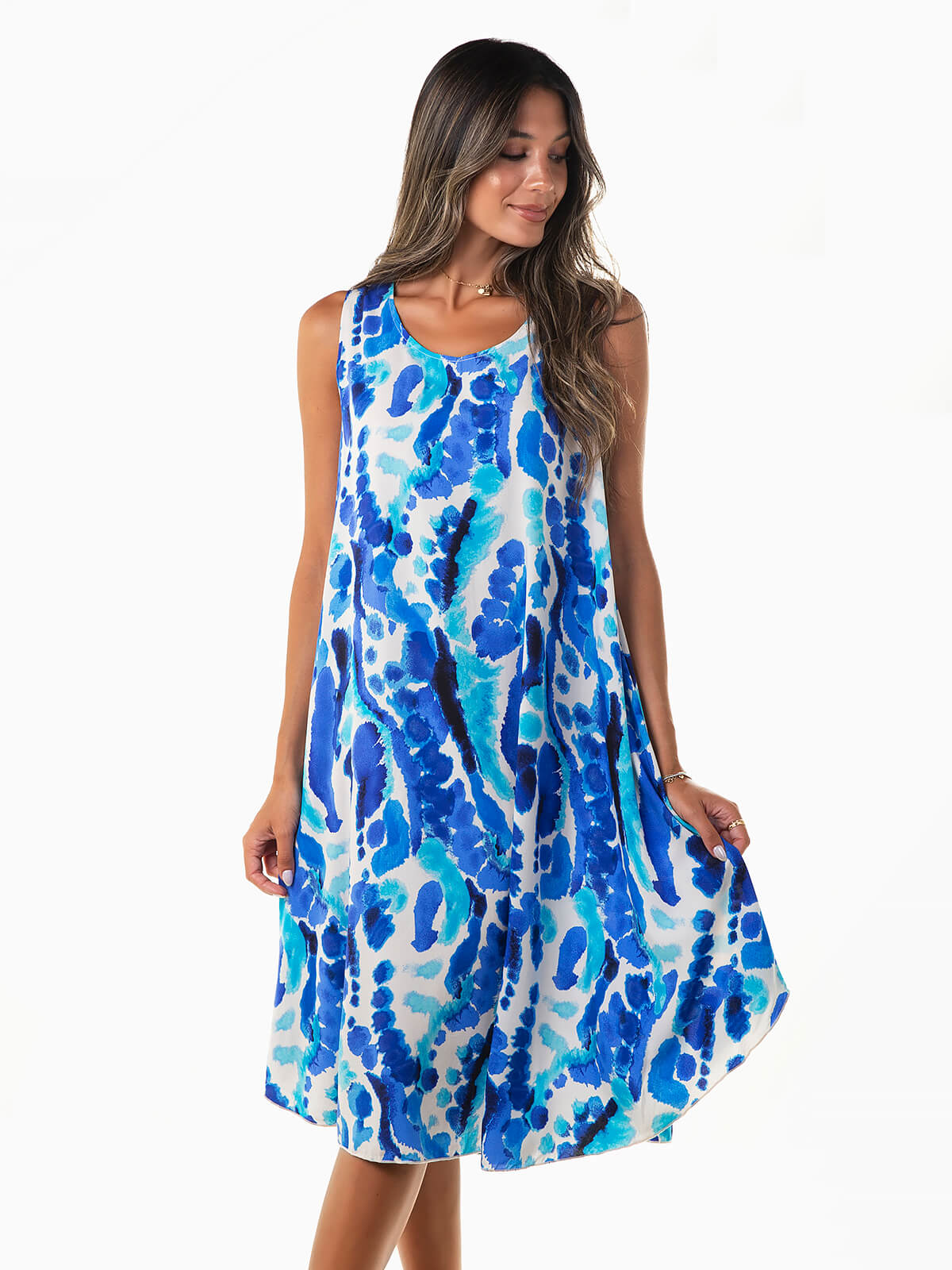 Vestido midi largo com estampado manchado e corte evasé. Vestido alças confecionado em tecido 100% algodão, leve e fresco com cós arredondado. Decote redondo.