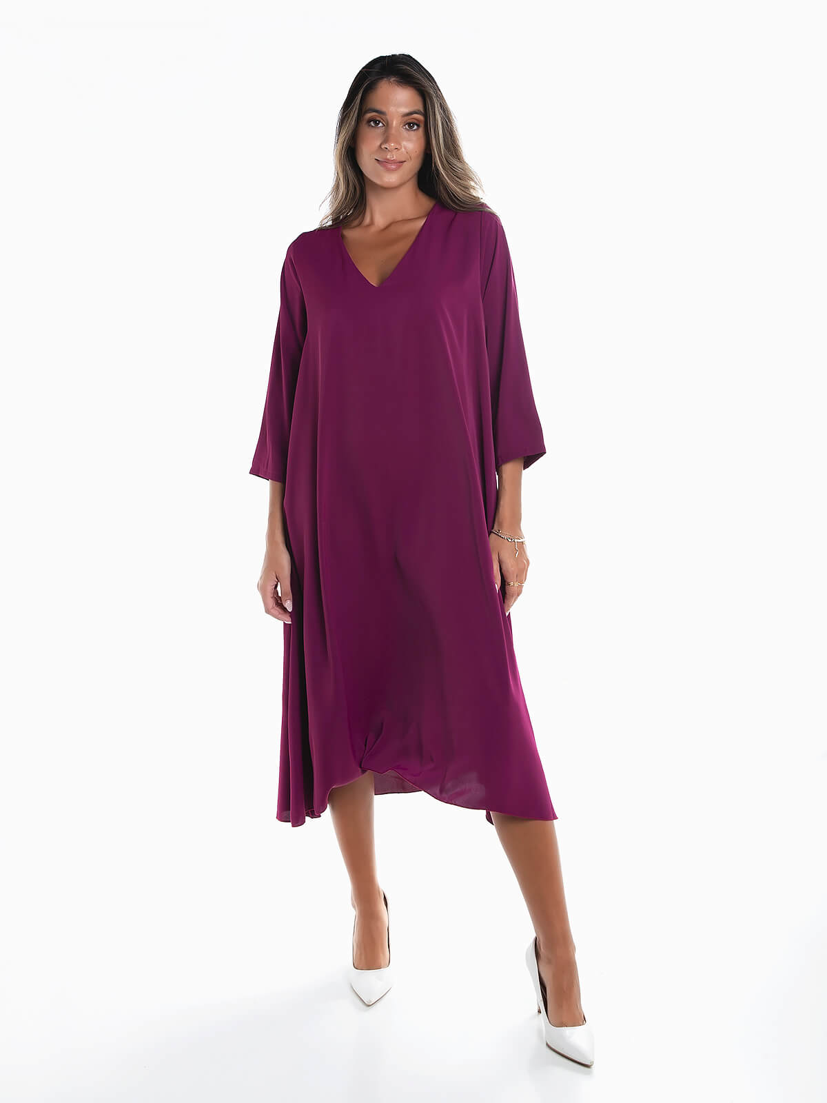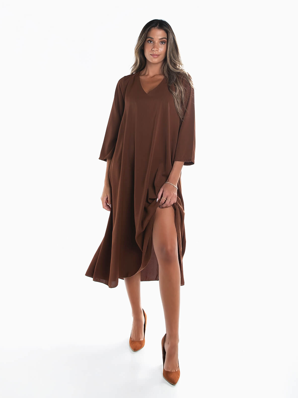 Vestido midi fluído com manga 3/4 e decote em bico. Vestido de corte evasé.