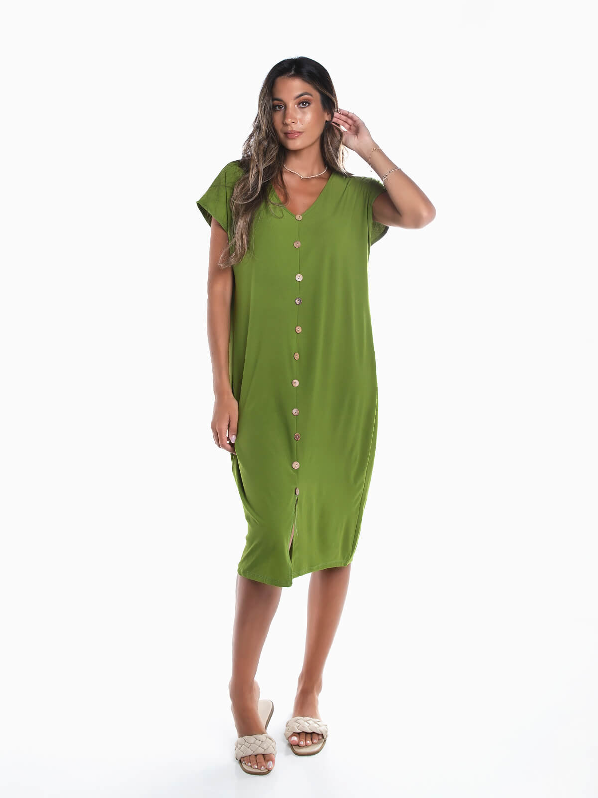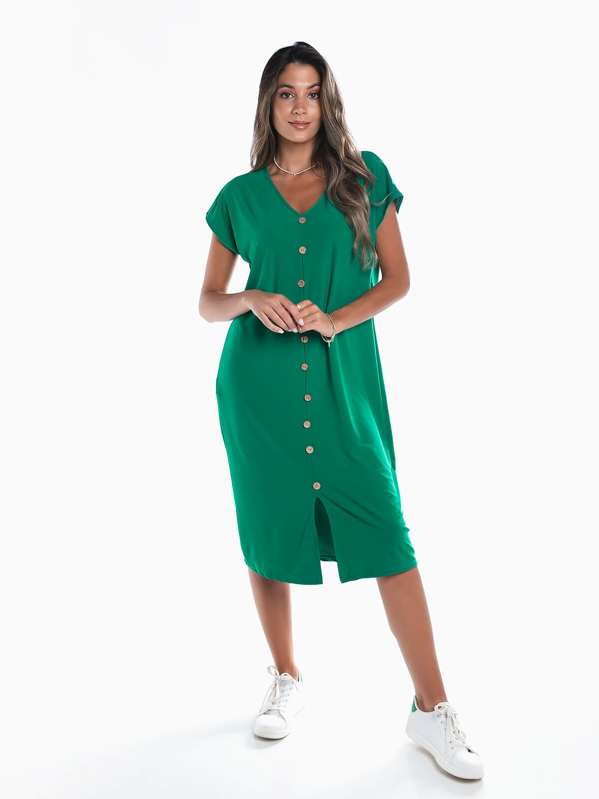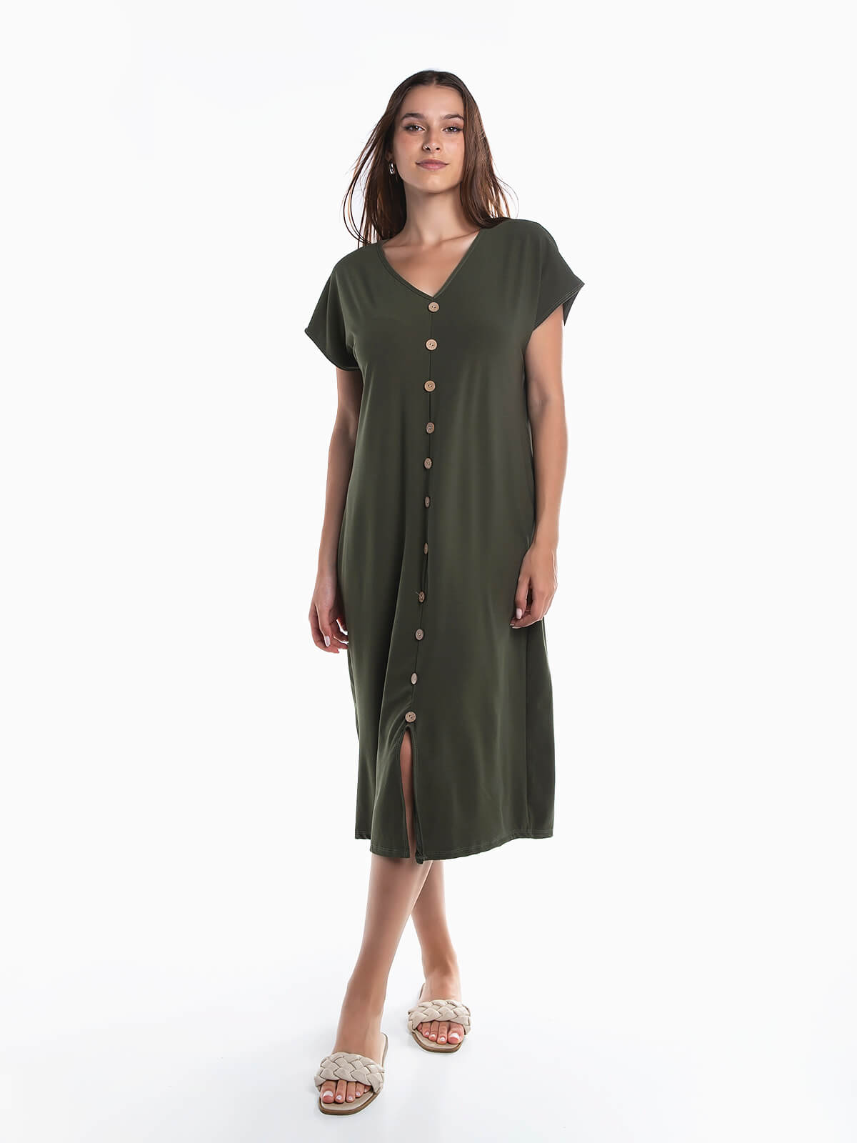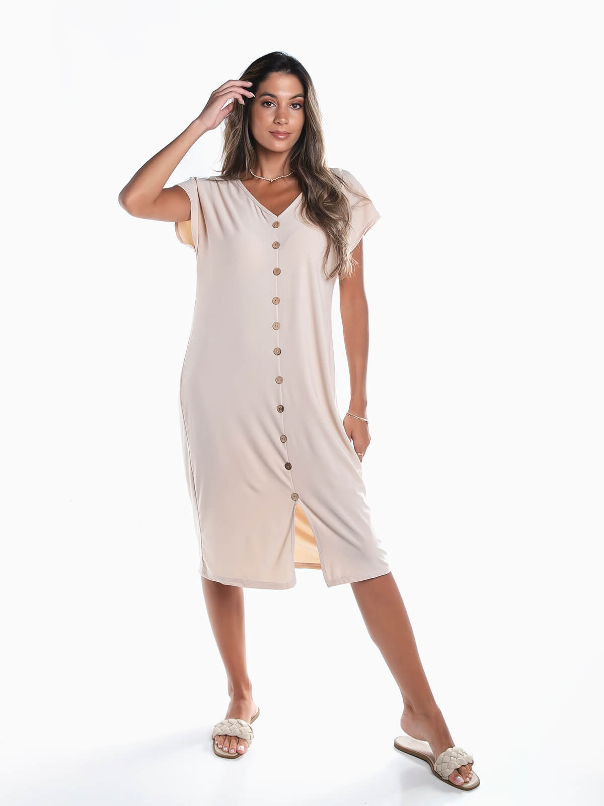 Vestido midi fluído de manga curta para senhora. Vestido para senhora com decote em bico e botões decorativos. Abertura frontal.