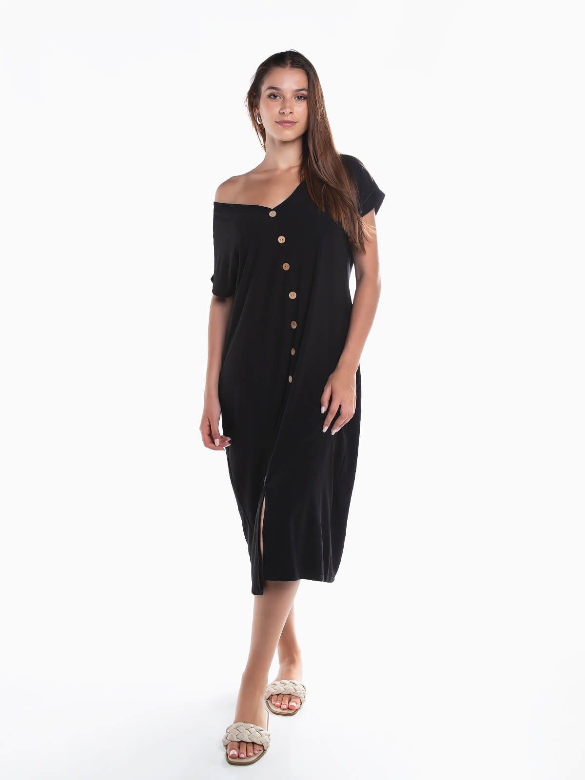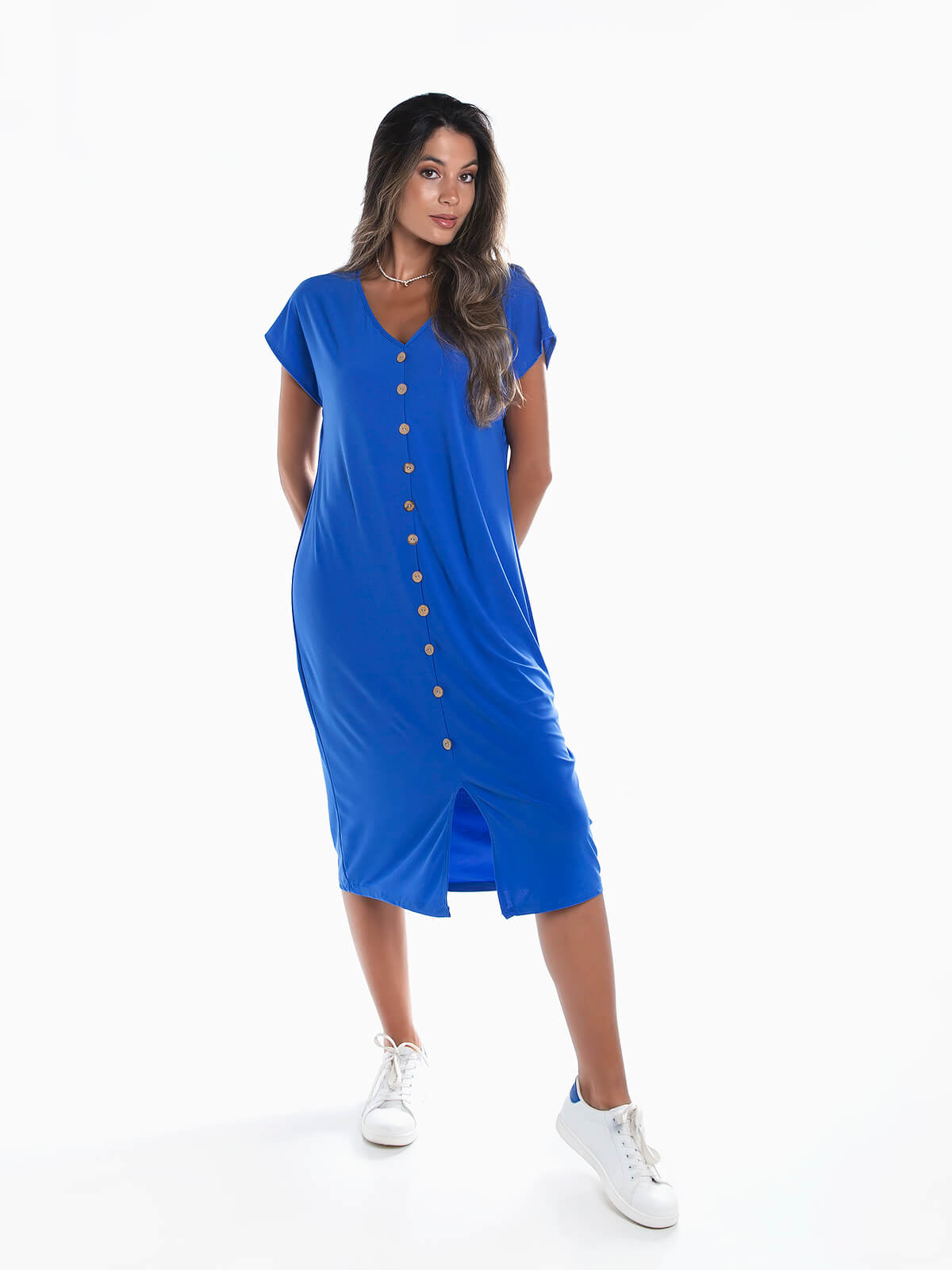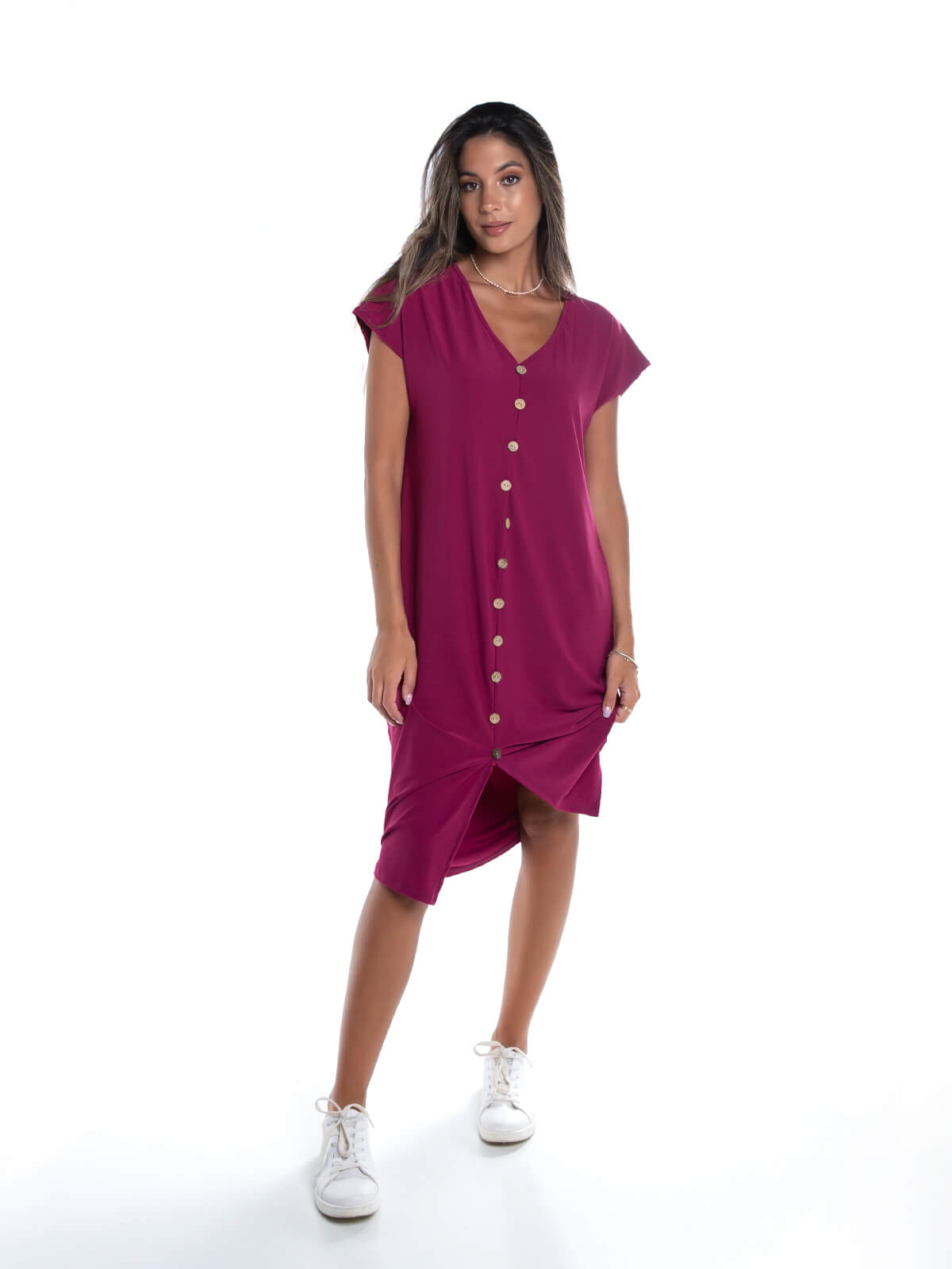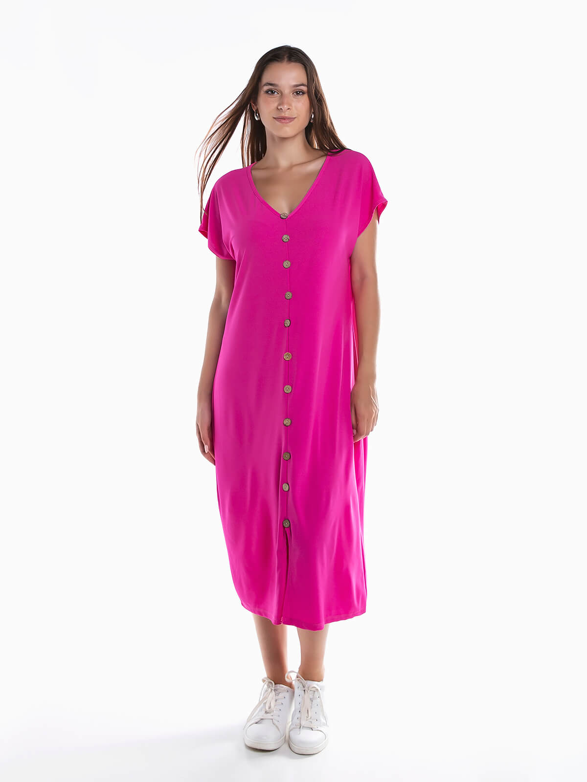 Vestido midi fluído de manga curta para senhora. Vestido para senhora com decote em bico e botões decorativos. Abertura frontal.