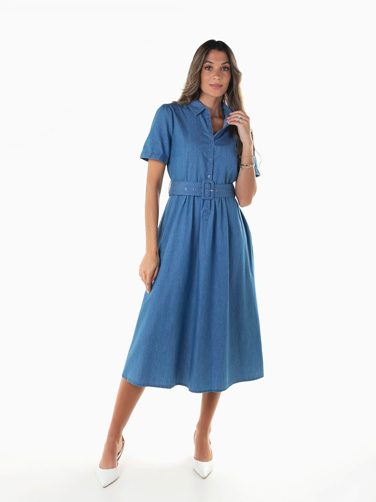 Vestido de ganga midi com cinto para ajustar. Vestido camiseiro de manga curta com gola abas e aperto de botões. Corte evasé.