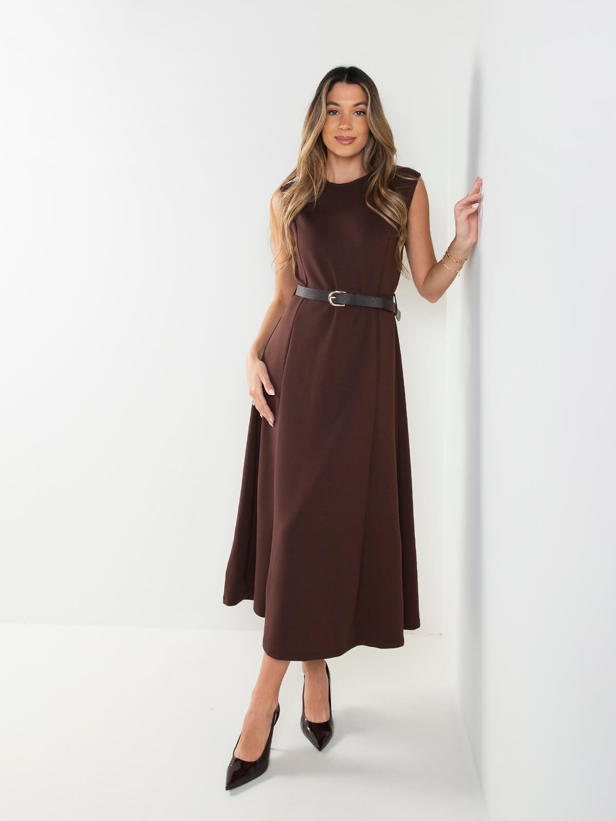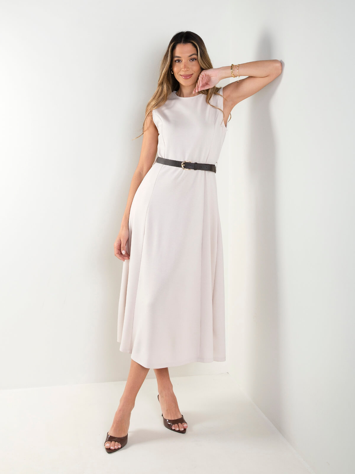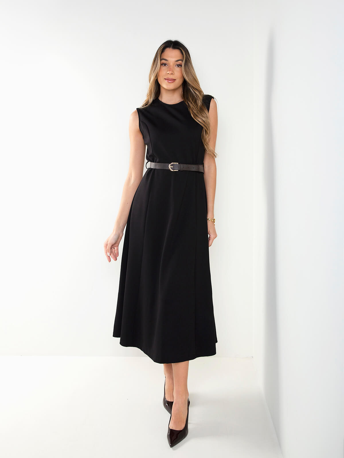 Vestido midi halter com cinto efeito pele incluído. Modelo elegante e fluido, ideal para eventos, jantares ou looks sofisticados do dia a dia.