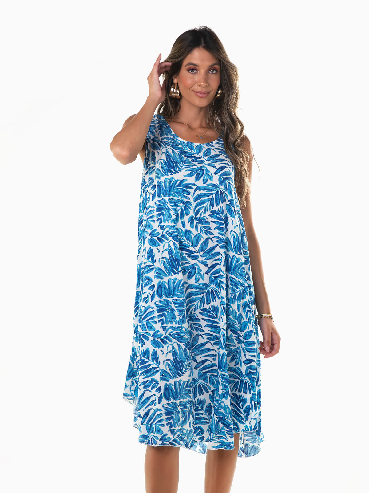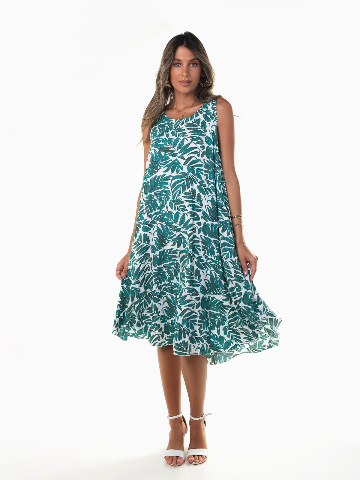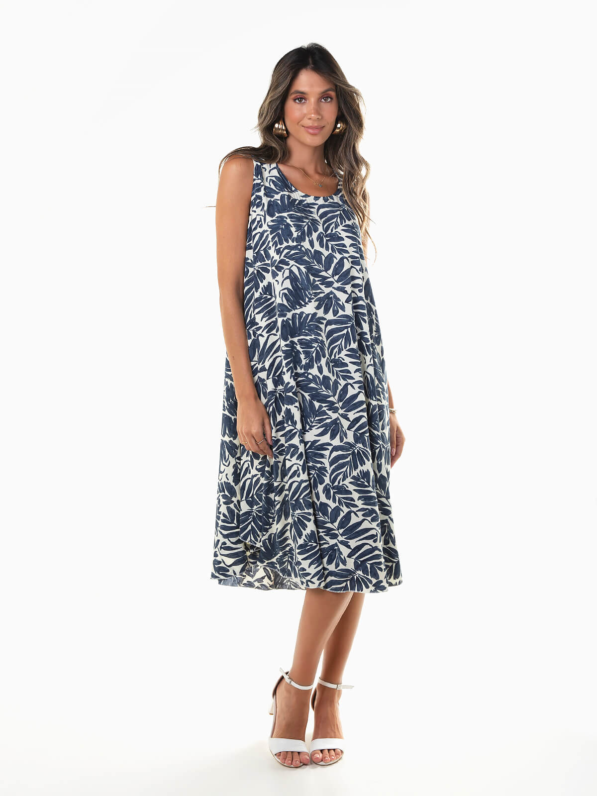 Vestido midi largo com padrão de folhas para senhora. Vestido fluído com alças largas. Decote redondo. Corte evasé.