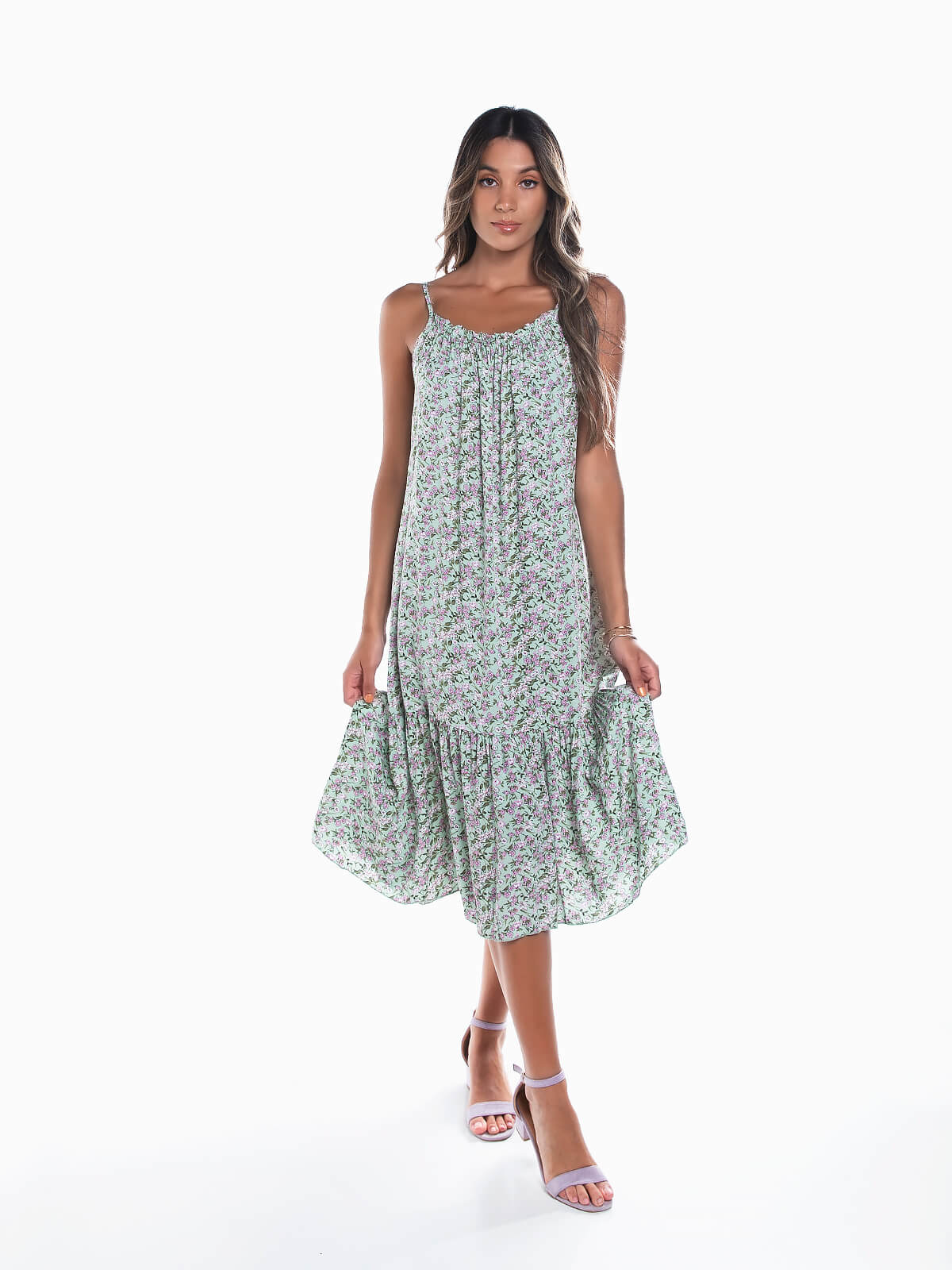 Vestido midi largo com estampado de flores para senhora. Vestido de alças finas com encaixe de folho na base e decote redondo.