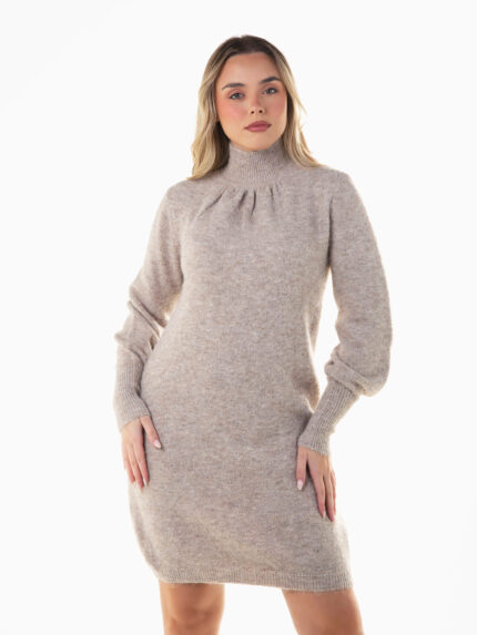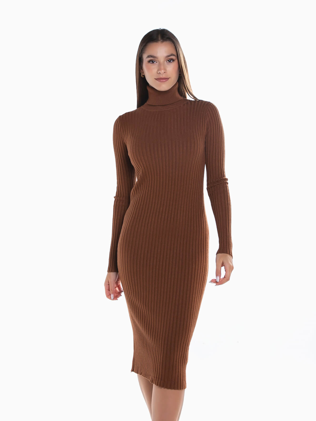 Vestido midi em malha canelada com mistura de lã e seda para maior conforto. Vestido justo manga comprida com gola alta dobrada. Abertura na parte posterior.
