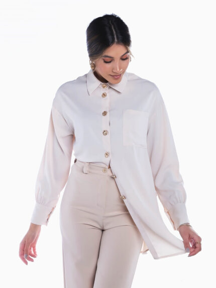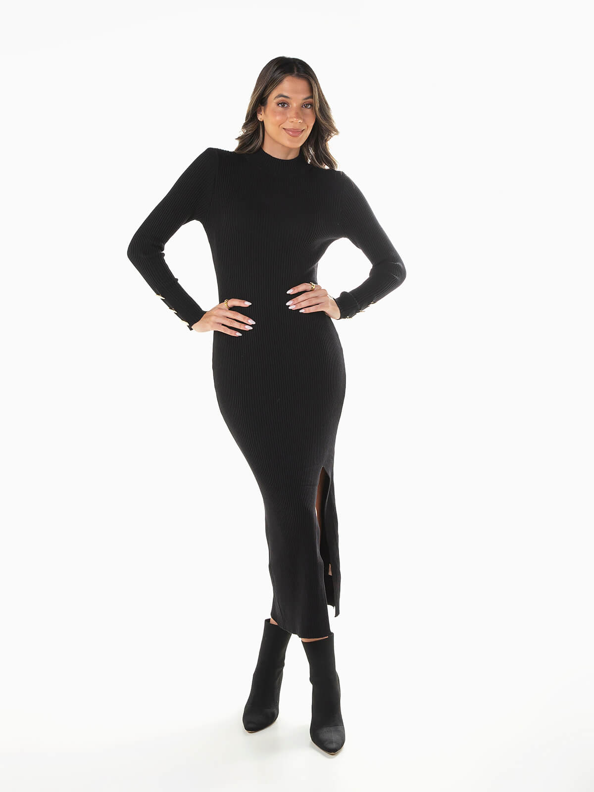 Vestido midi em malha canelada com abertura na base. Vestido justo de manga comprida com botões de pérola aplicados nos punhos. Gola perkins.