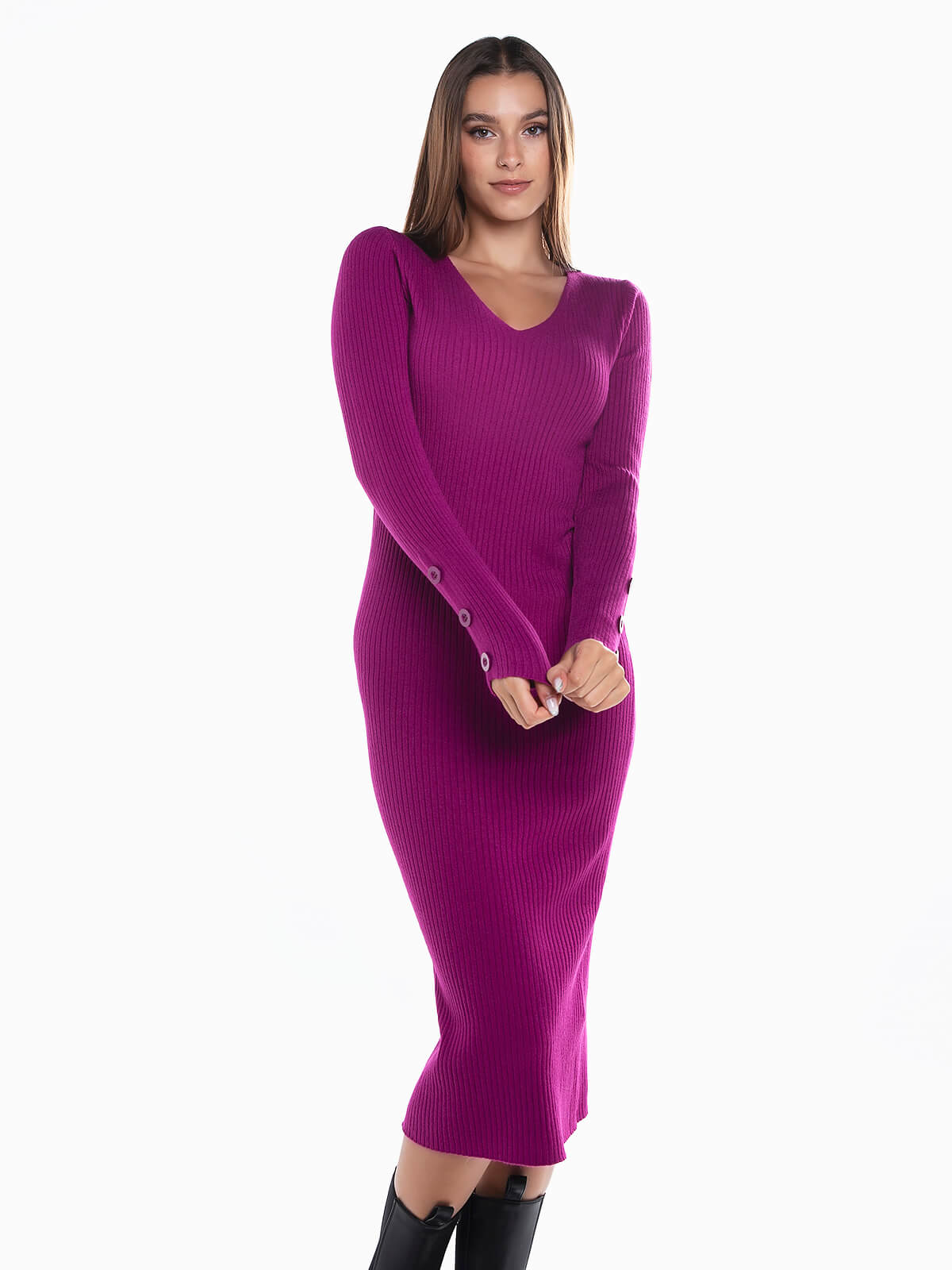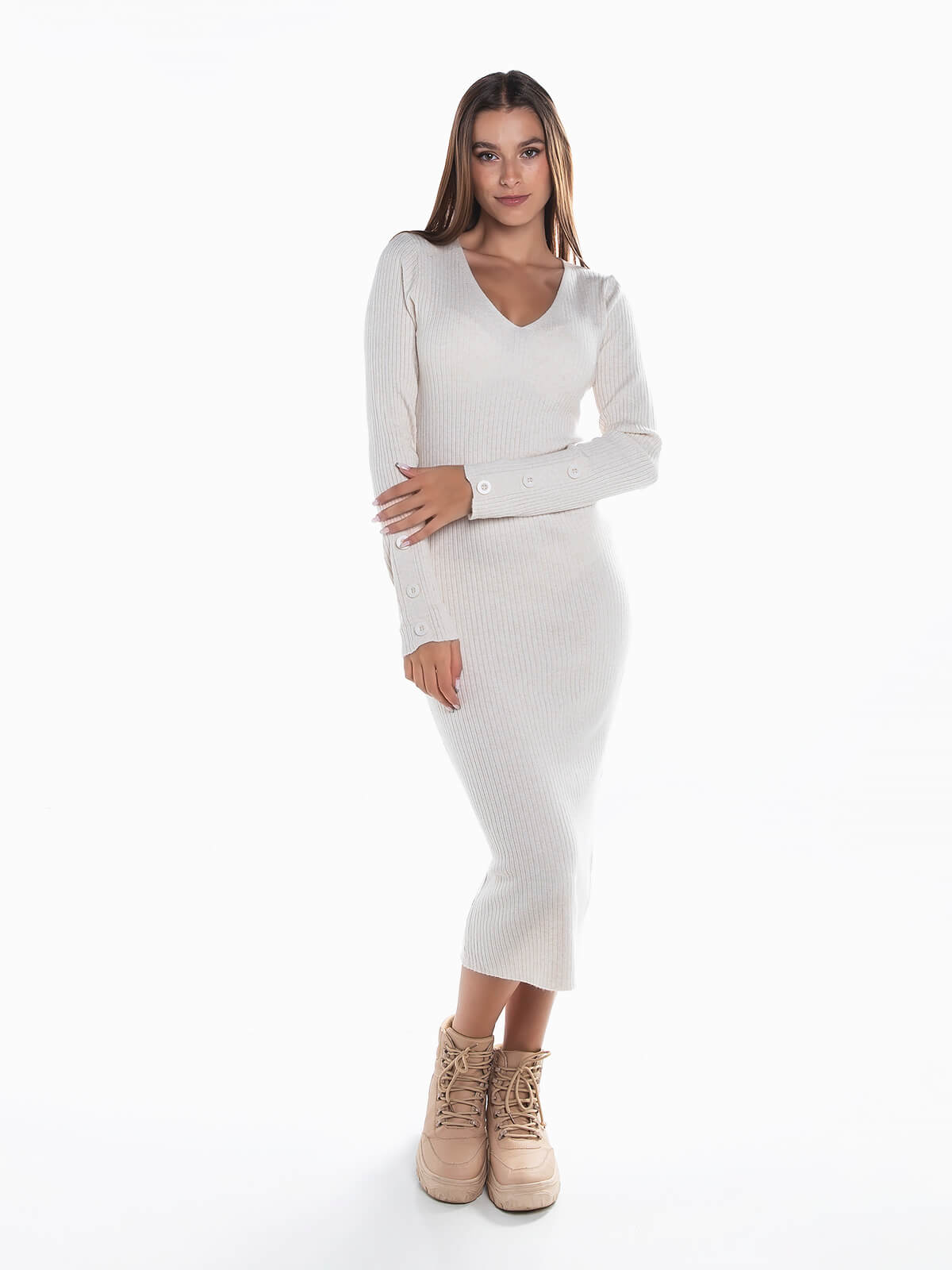 Vestido midi em malha canelada de toque suave. Vestido manga comprida com botões aplicados nos punhos. Decote em V.