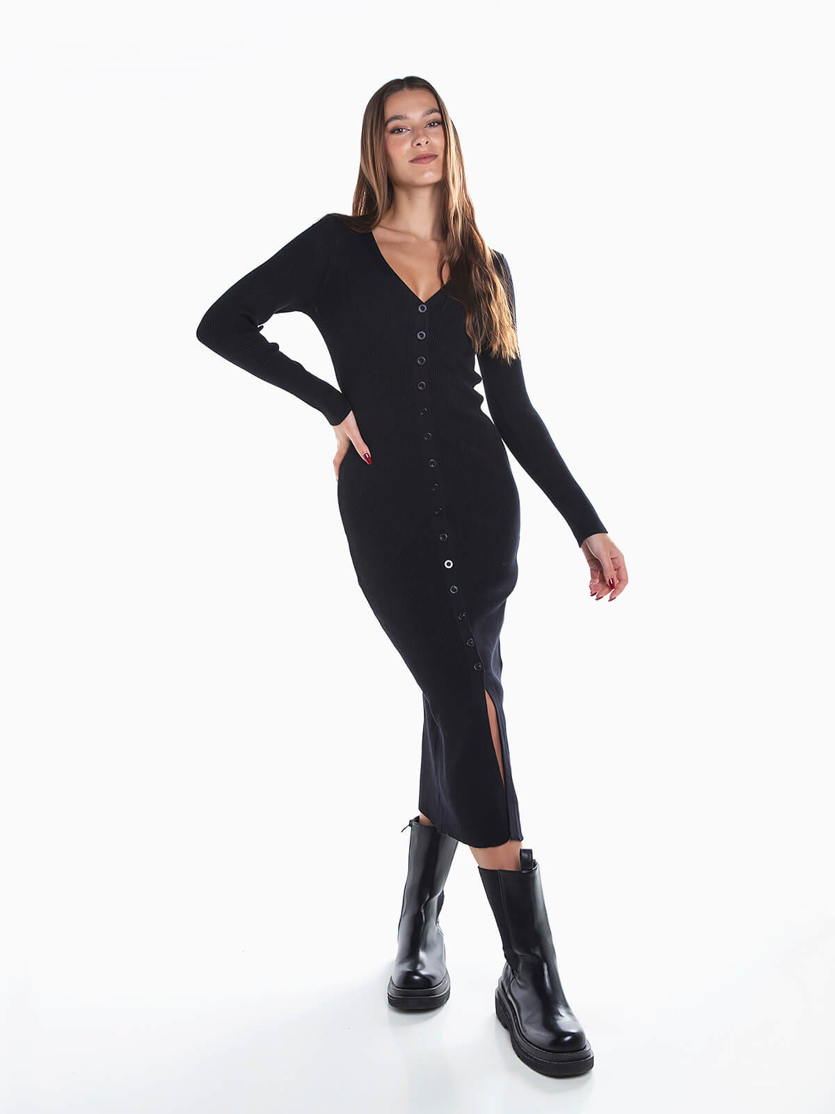 Vestido midi malha canelada com aperto de botões. Vestido justo de manga comprida com decote em V. Abertura na base.