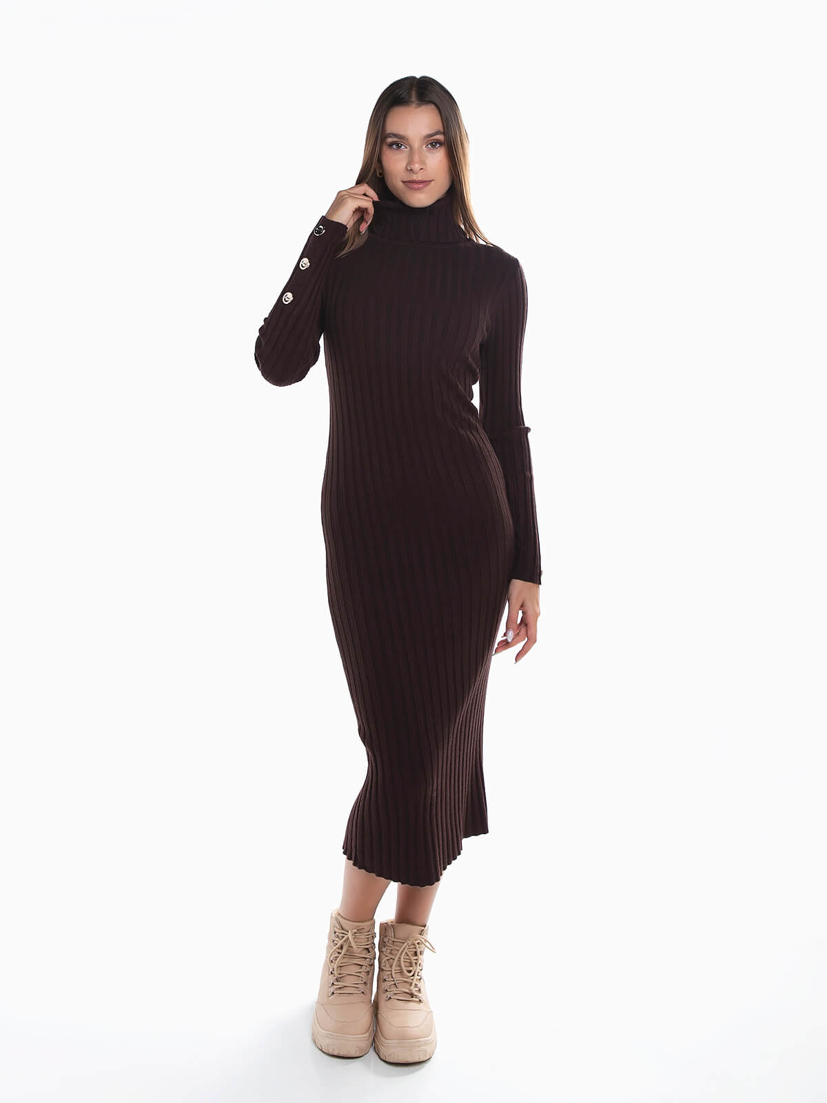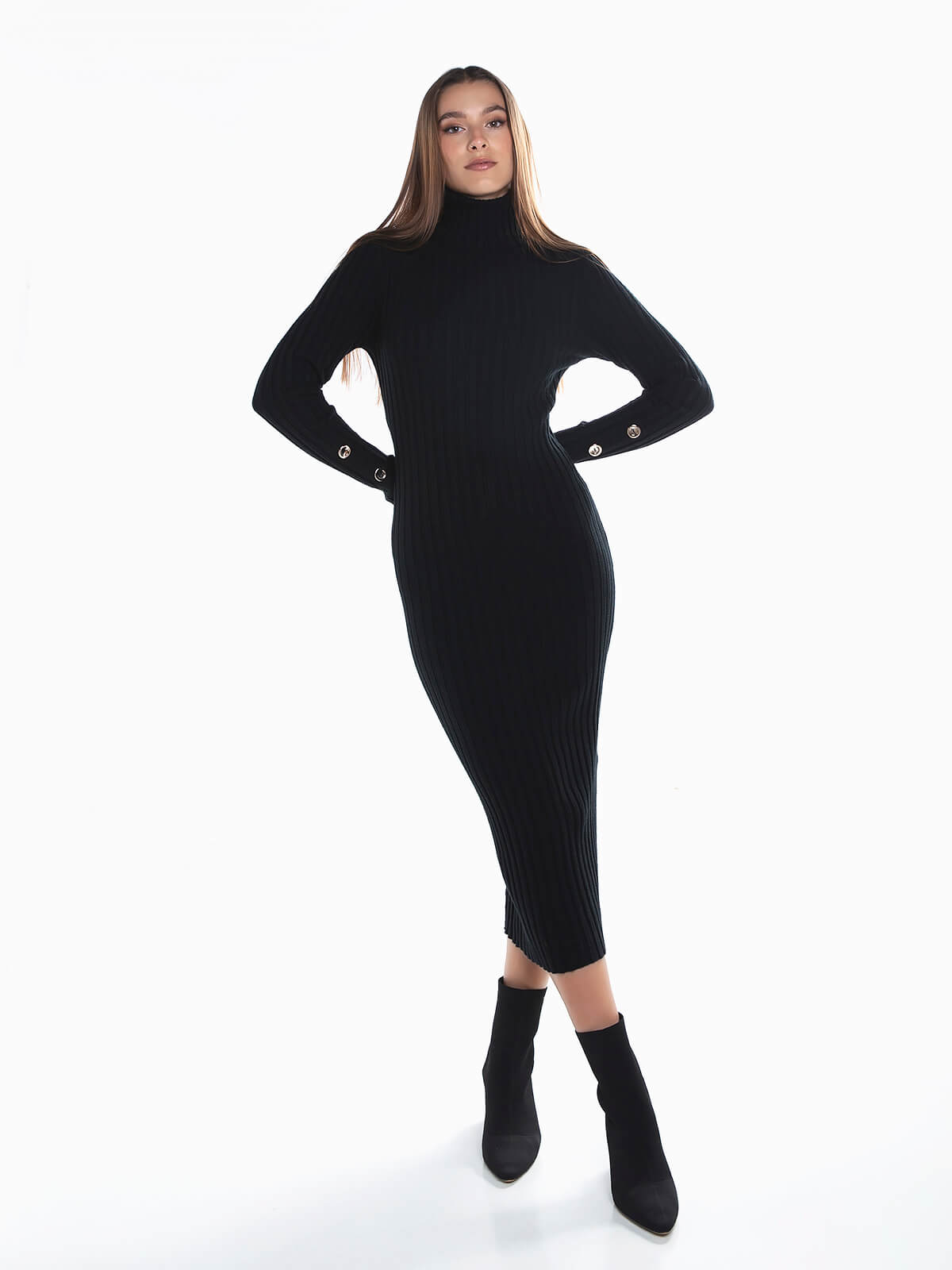 Vestido midi em malha canelada para senhora. Vestido justo de manga comprida com gola alta dobrada. Botões aplicados nos punhos.