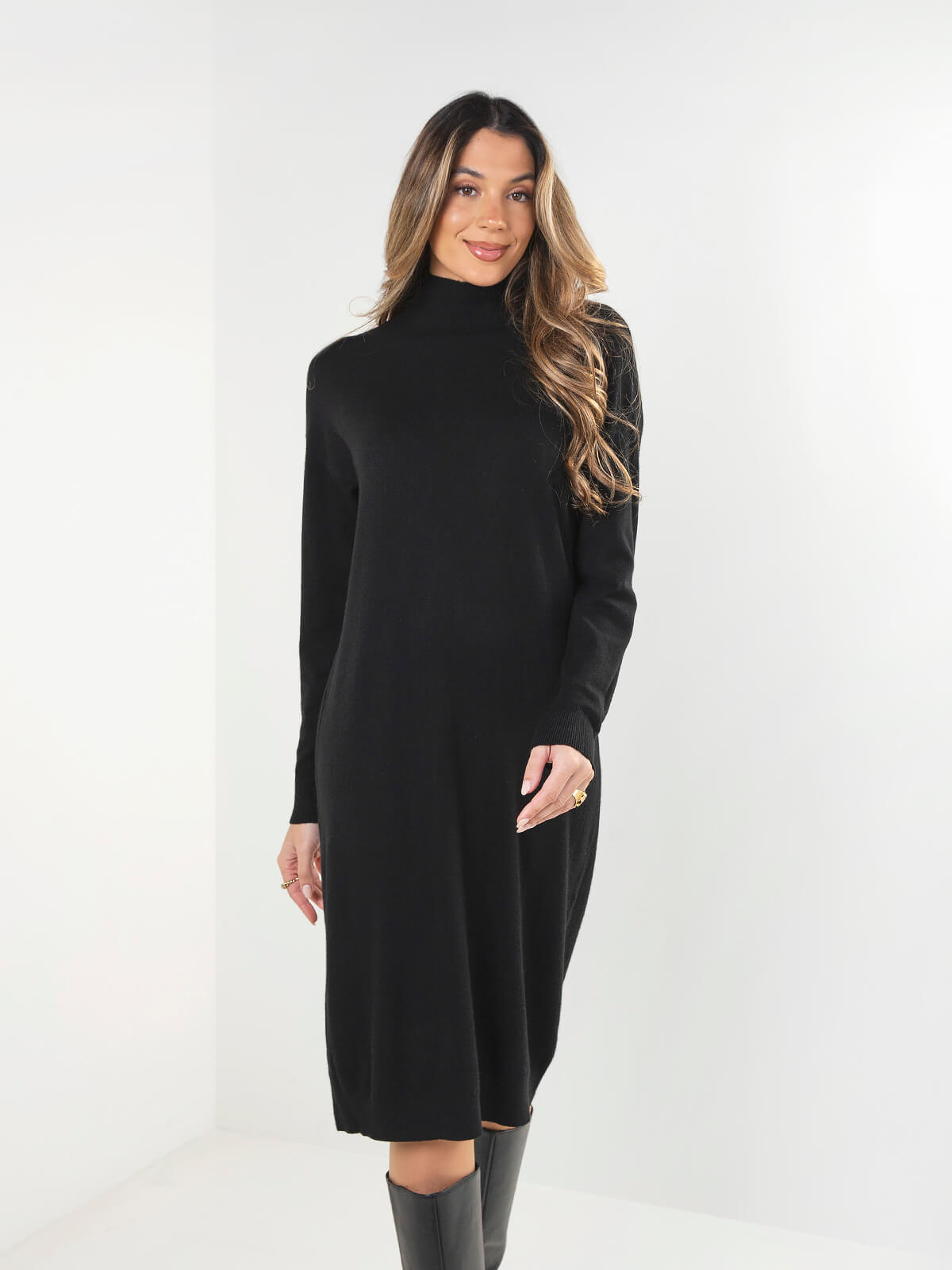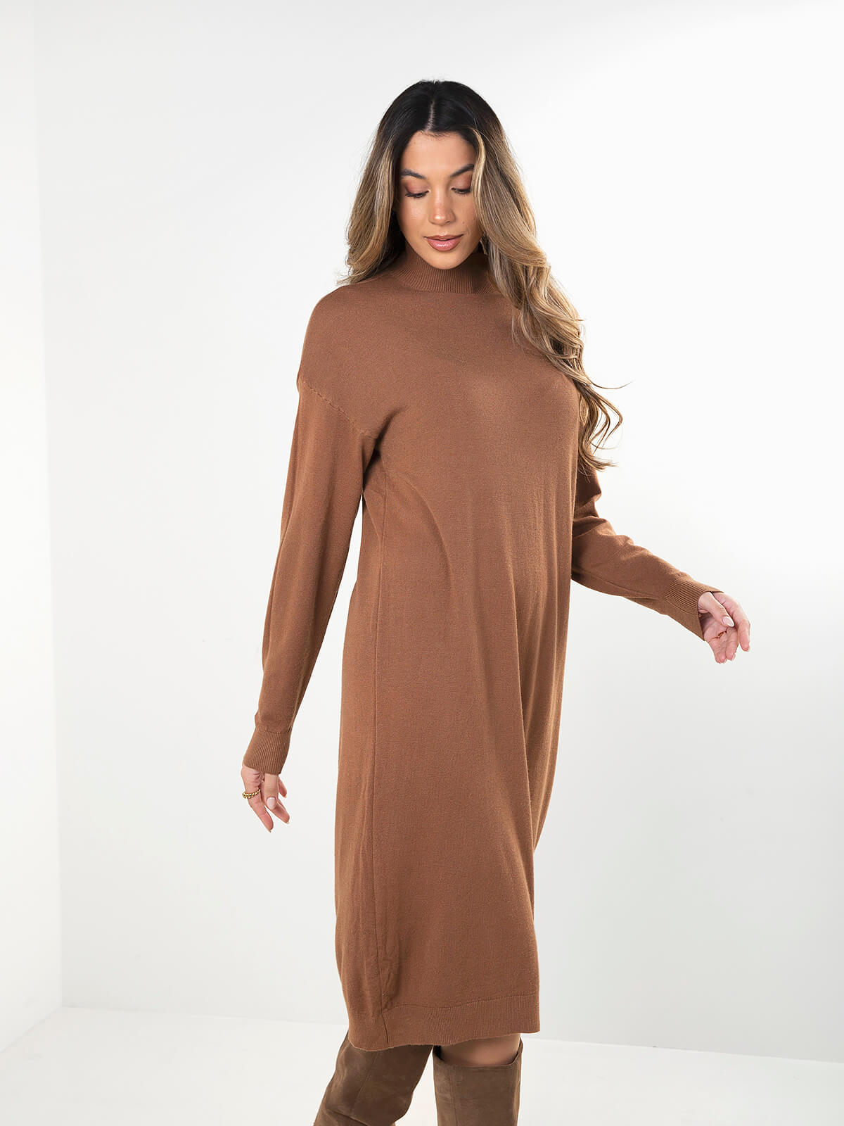 Vestido midi de malha com mistura de viscose para maior conforto. Vestido largo de manga comprida com gola subida e acabamentos canelados.