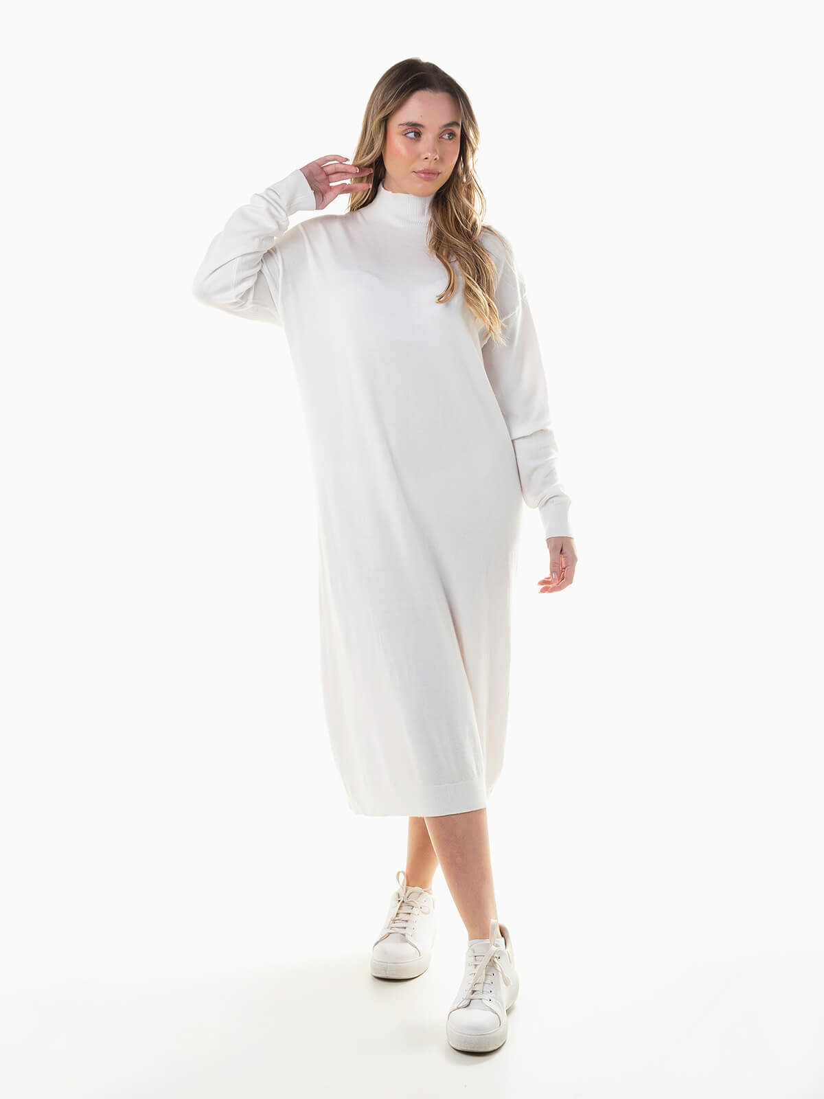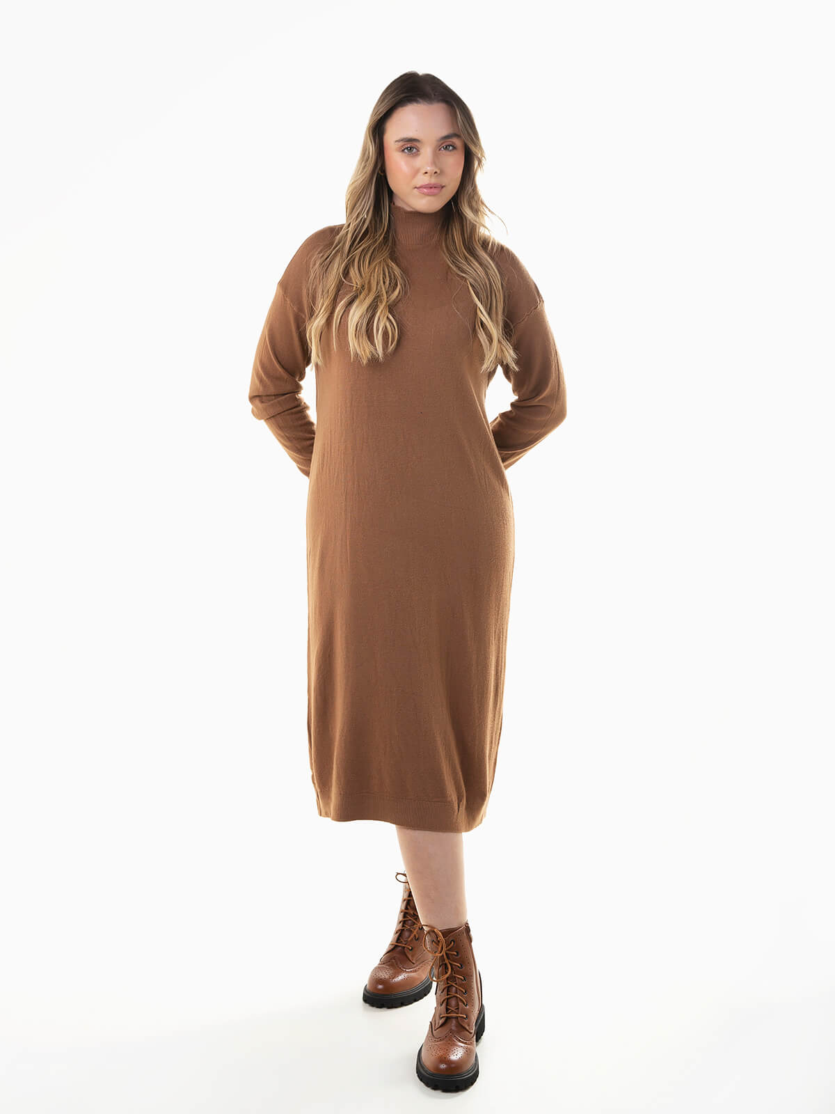 Vestido midi de malha com mistura de viscose para maior conforto. Vestido largo de manga comprida com gola subida e acabamentos canelados.
