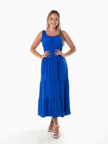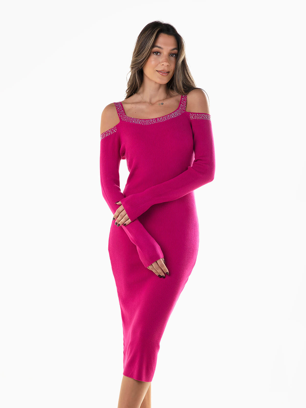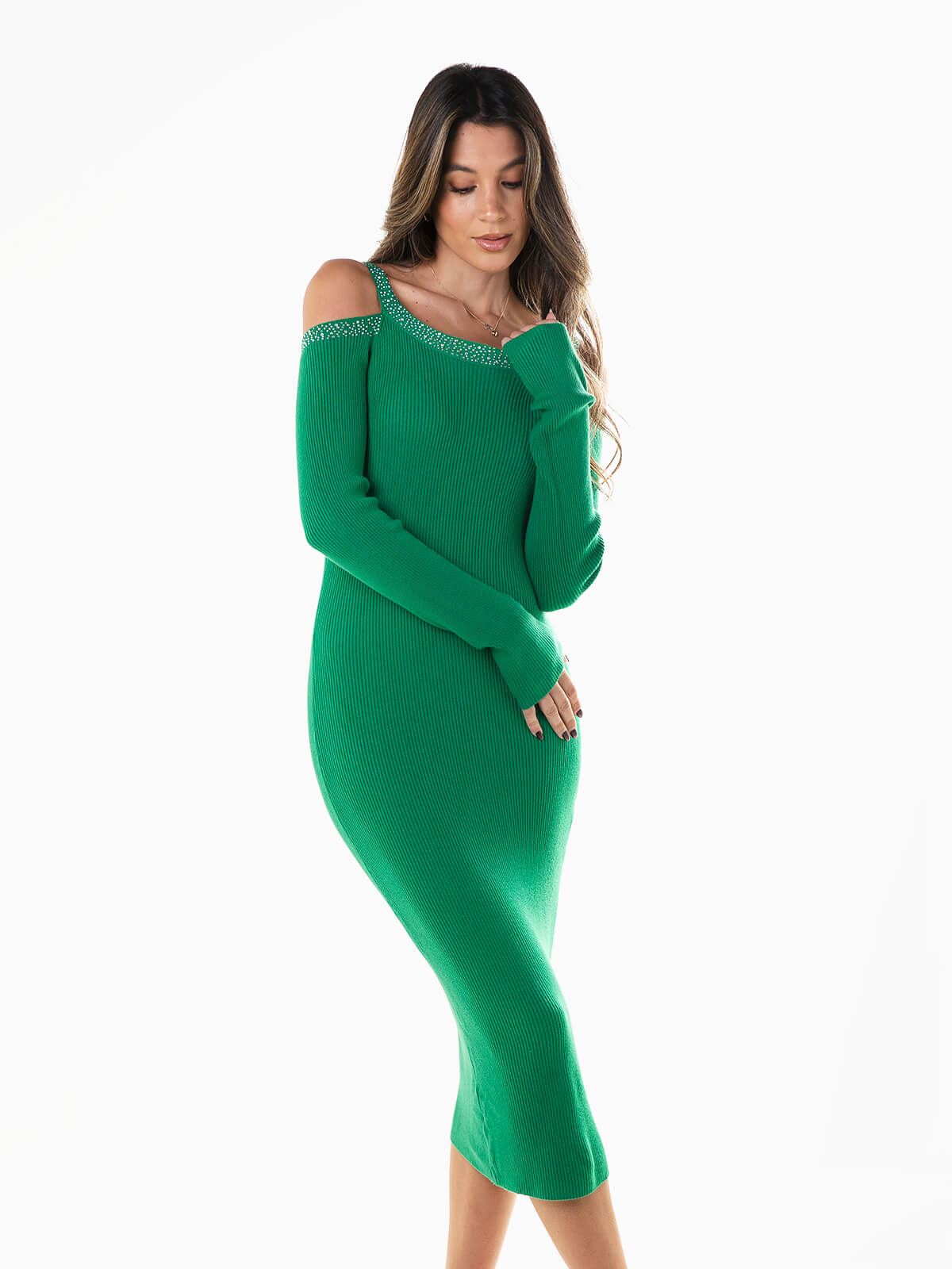 Vestido midi em malha canelada com pormenores recortados nos ombros. Vestido justo de manga comprida com aplicações de strass. Decote quadrado.