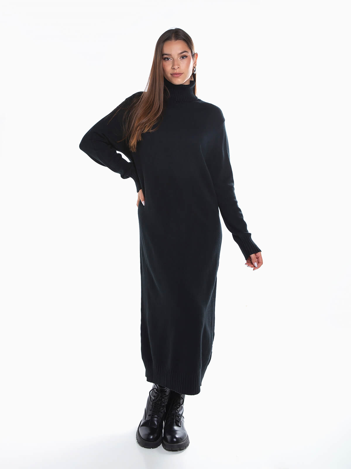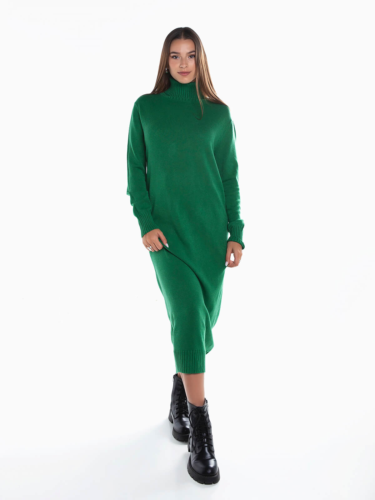 Vestido midi em malha aconchegante com mistura lã. Vestido de gola alta com manga comprida e acabamentos canelados.
