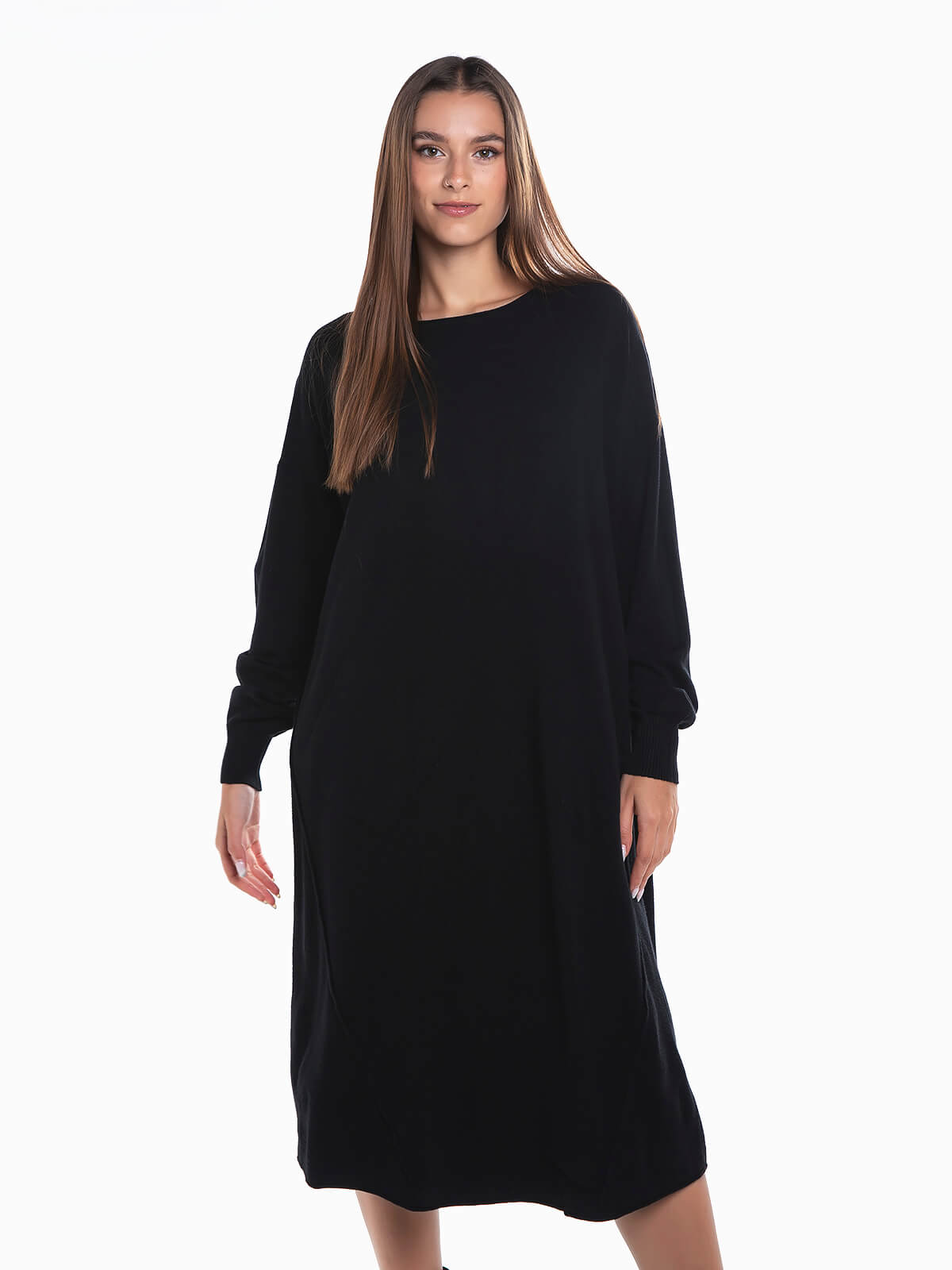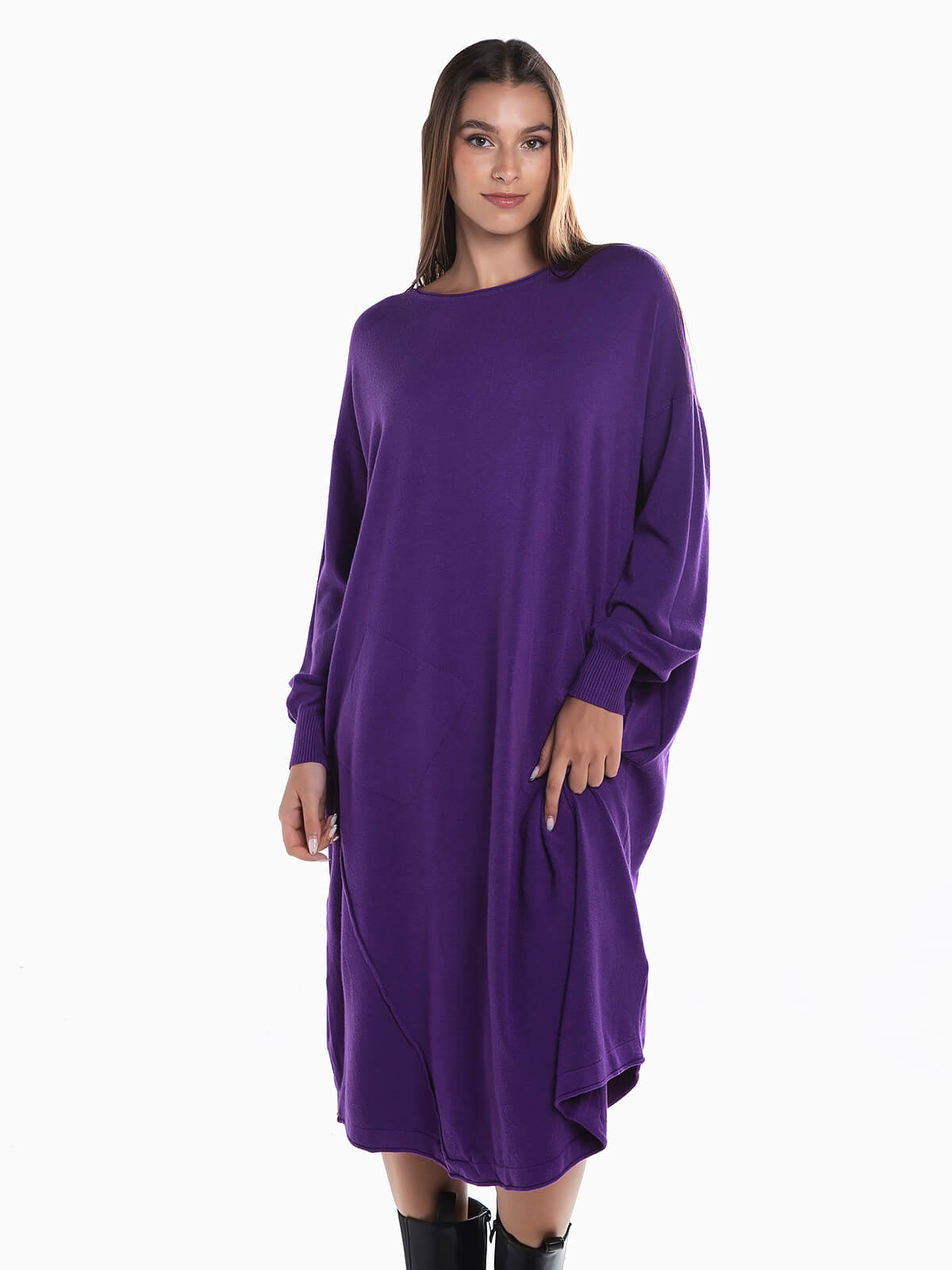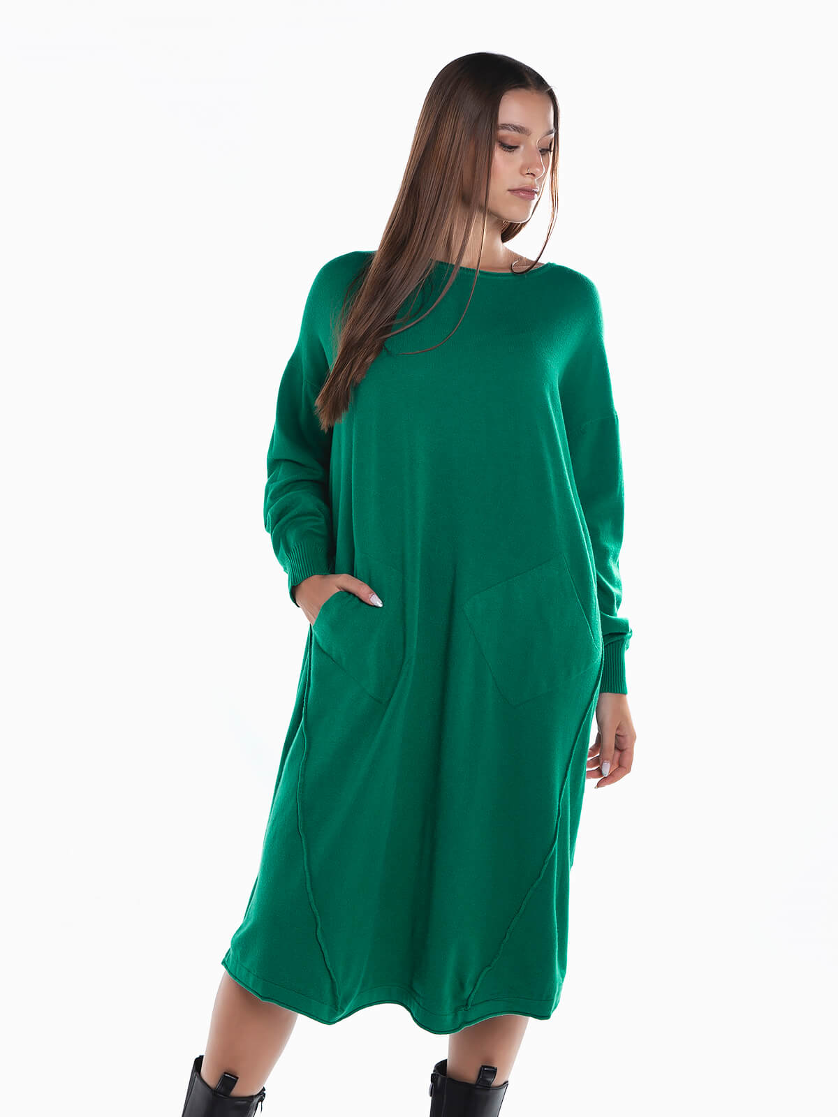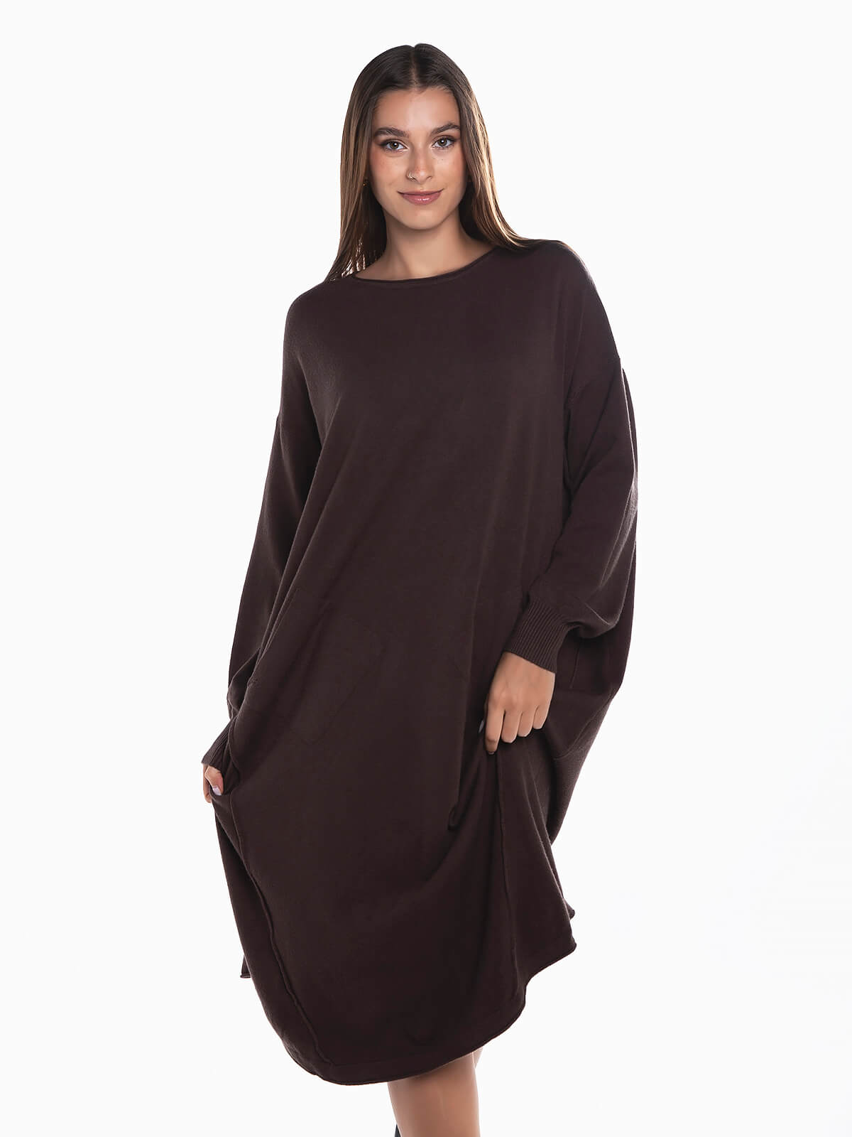 Vestido midi em malha para senhora. Vestido ovesize de manga comprida com punhos canelados. Decote redondo e 2 bolsos à frente.